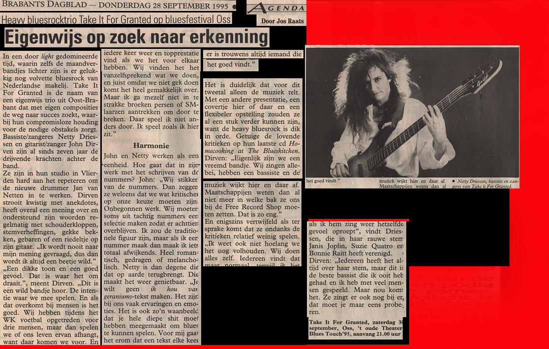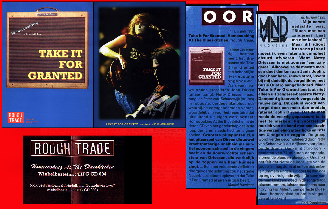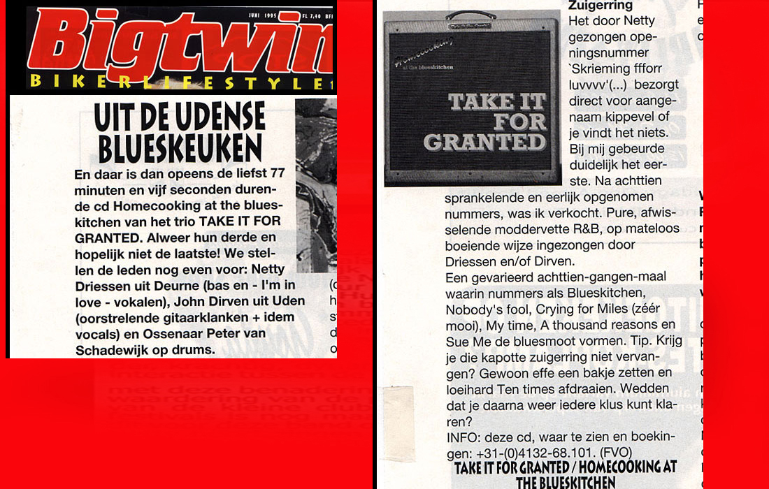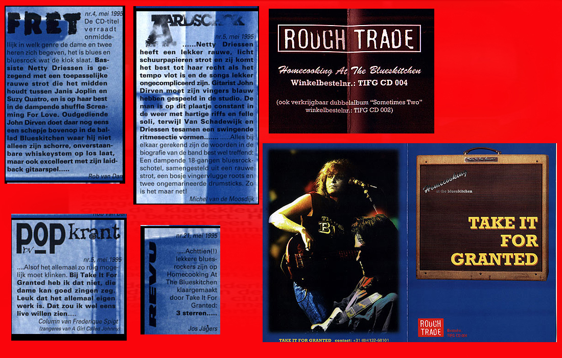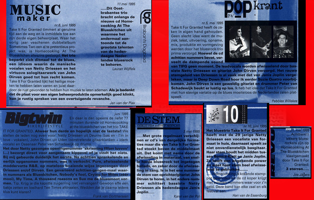 .....................many many times, Oor, Stage, Aardschok, Rif Raf, Big Twin, Mind View, Revu, Eindhovens Dagblad, Friesch Dablad, Groot Eindhoven, Haarlemmermeers Dagblad, Helmonds Dagblad, Traverse, Block, Jassepoes, Hendrixfanclub Germany, Udens Weekblad, Oostbrabant, Gitaar Plus, Gitarist, Volkskrant, Panorama, Alles op Tien,Travers, Aloha,de Sleutel Oss), Tubantia (Twente), de Brug, Leeuwarder Courant, Groovemaster, Dagblad Zaanstreek, Back to the Roots, Metal Maidens, Rockgirl, Kindamuzik, BV Popkrant, Bobtjeblues, Blues Das deutsche Bluesmagazin, Music in Belgium, Brabants Dagblad, Dienblad, Alternative ways, Track, De Stem, Backline, Brabant Pop, Musicmaker, Moors Magazine, GEZIEN-GEHOORD.NL, Blueszine, Maxazine, de Gelderlander, Popmagazine Heaven, Festivalinfo, File Under, and lots of local papers, alone or in combination with Take it for granted, Netty Driessen, Rosa King, Rob Hoeke, Sander Boes, Ben van de Wal, Bertus Borgers, Walter Trout, Ana Popovic, Jesse Gang, Ritchie Severijns, Eamonn Mccormack, Rob Snijders, Fred Hoogendoorn, Sjoerd van Bommel, Hans Dulfer, Peter van Schadewijk, Iwan Wijnen, Tony Peters, Bonki Bongaerts, Thijs van Leer, John Lagrand, Nicko Christiansen and many many more and lots of radio, local, national and all over the globe from Japan, Spain, UK, Denmark, Germany to the USA and back...............