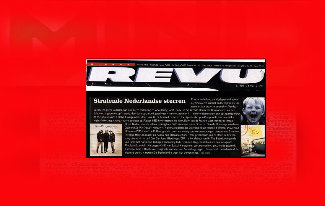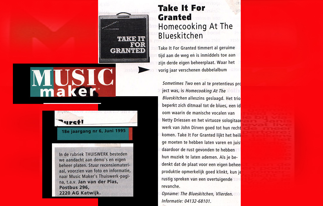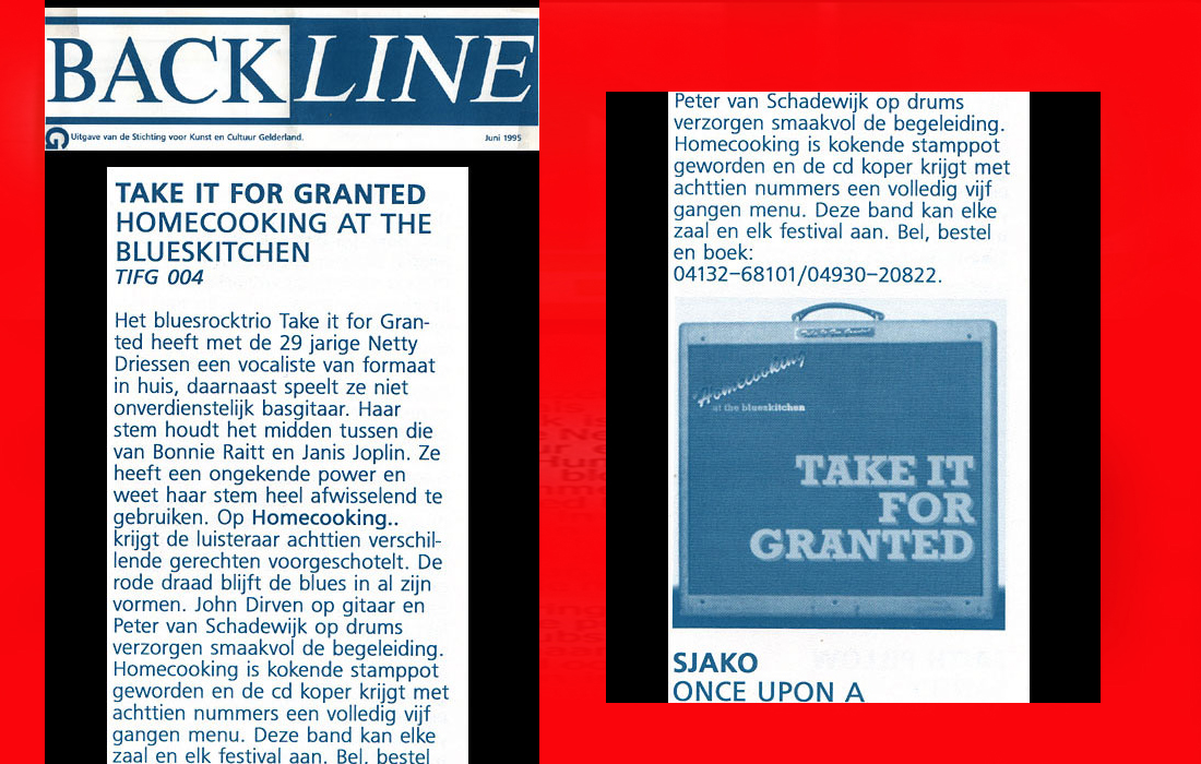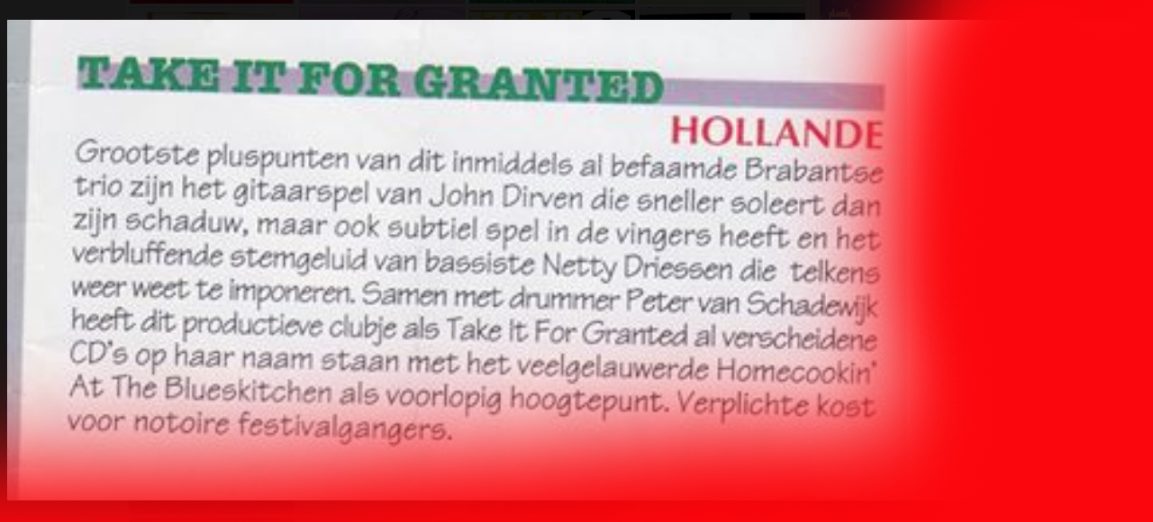 .....................many many times, Oor, Stage, Aardschok, Rif Raf, Big Twin, Mind View, Revu, Eindhovens Dagblad, Friesch Dablad, Groot Eindhoven, Haarlemmermeers Dagblad, Helmonds Dagblad, Traverse, Block, Jassepoes, Hendrixfanclub Germany, Udens Weekblad, Oostbrabant, Gitaar Plus, Gitarist, Volkskrant, Panorama, Alles op Tien,Travers, Aloha,de Sleutel Oss), Tubantia (Twente), de Brug, Leeuwarder Courant, Groovemaster, Dagblad Zaanstreek, Back to the Roots, Metal Maidens, Rockgirl, Kindamuzik, BV Popkrant, Bobtjeblues, Blues Das deutsche Bluesmagazin, Music in Belgium, Brabants Dagblad, Dienblad, Alternative ways, Track, De Stem, Backline, Brabant Pop, Musicmaker, Moors Magazine, GEZIEN-GEHOORD.NL, Blueszine, Maxazine, de Gelderlander, Popmagazine Heaven, Festivalinfo, File Under, and lots of local papers, alone or in combination with Take it for granted, Netty Driessen, Rosa King, Rob Hoeke, Sander Boes, Ben van de Wal, Bertus Borgers, Walter Trout, Ana Popovic, Jesse Gang, Ritchie Severijns, Eamonn Mccormack, Rob Snijders, Fred Hoogendoorn, Sjoerd van Bommel, Hans Dulfer, Peter van Schadewijk, Iwan Wijnen, Tony Peters, Bonki Bongaerts, Thijs van Leer, John Lagrand, Nicko Christiansen and many many more and lots of radio, local, national and all over the globe from Japan, Spain, UK, Denmark, Germany to the USA and back...............
