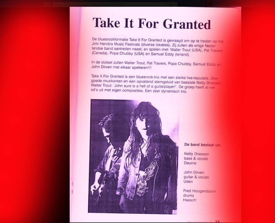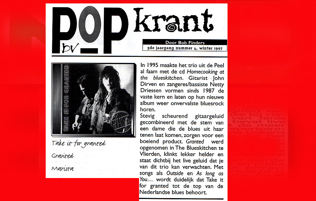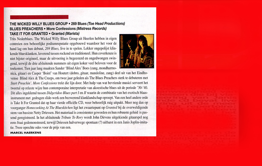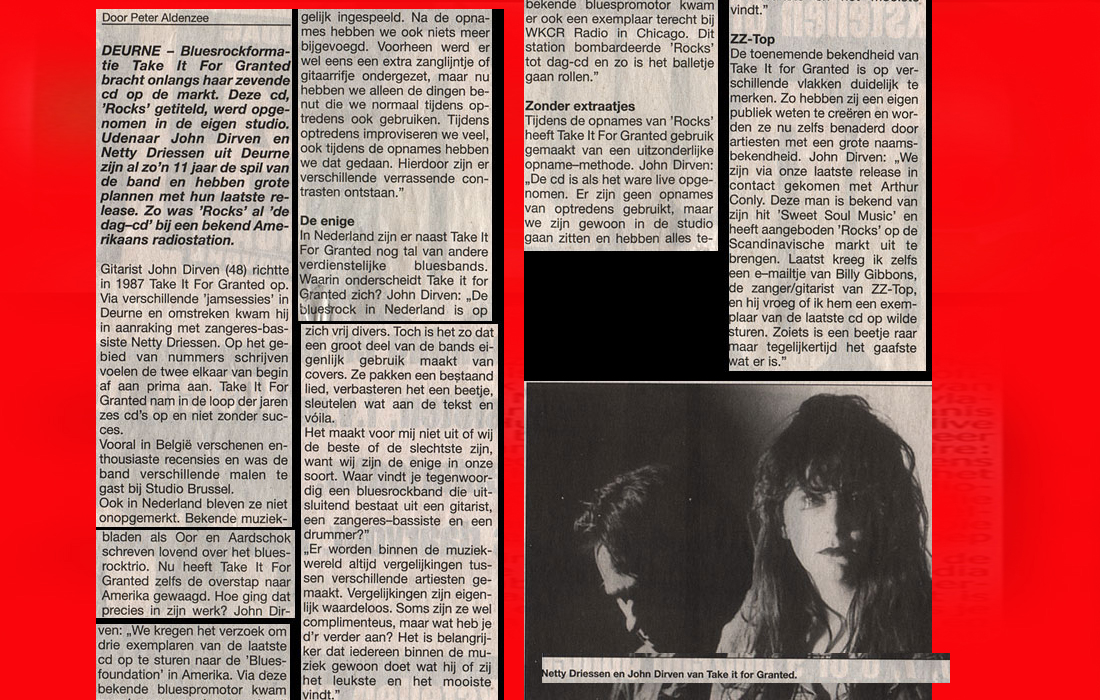 .....................many many times, Oor, Stage, Aardschok, Rif Raf, Big Twin, Mind View, Revu, Eindhovens Dagblad, Friesch Dablad, Groot Eindhoven, Haarlemmermeers Dagblad, Helmonds Dagblad, Traverse, Block, Jassepoes, Hendrixfanclub Germany, Udens Weekblad, Oostbrabant, Gitaar Plus, Gitarist, Volkskrant, Panorama, Alles op Tien,Travers, Aloha,de Sleutel Oss), Tubantia (Twente), de Brug, Leeuwarder Courant, Groovemaster, Dagblad Zaanstreek, Back to the Roots, Metal Maidens, Rockgirl, Kindamuzik, BV Popkrant, Bobtjeblues, Blues Das deutsche Bluesmagazin, Music in Belgium, Brabants Dagblad, Dienblad, Alternative ways, Track, De Stem, Backline, Brabant Pop, Musicmaker, Moors Magazine, GEZIEN-GEHOORD.NL, Blueszine, Maxazine, de Gelderlander, Popmagazine Heaven, Festivalinfo, File Under, and lots of local papers, alone or in combination with Take it for granted, Netty Driessen, Rosa King, Rob Hoeke, Sander Boes, Ben van de Wal, Bertus Borgers, Walter Trout, Ana Popovic, Jesse Gang, Ritchie Severijns, Eamonn Mccormack, Rob Snijders, Fred Hoogendoorn, Sjoerd van Bommel, Hans Dulfer, Peter van Schadewijk, Iwan Wijnen, Tony Peters, Bonki Bongaerts, Thijs van Leer, John Lagrand, Nicko Christiansen and many many more and lots of radio, local, national and all over the globe from Japan, Spain, UK, Denmark, Germany to the USA and back...............