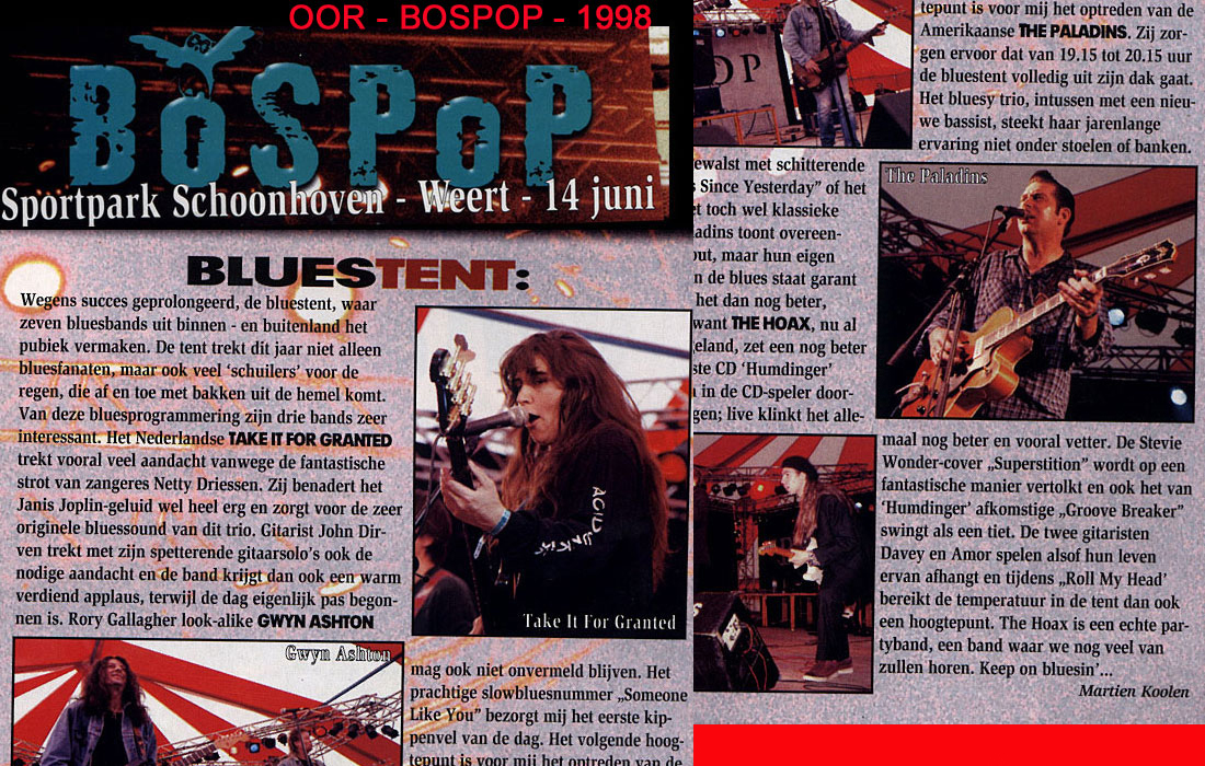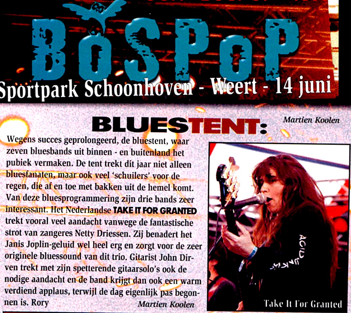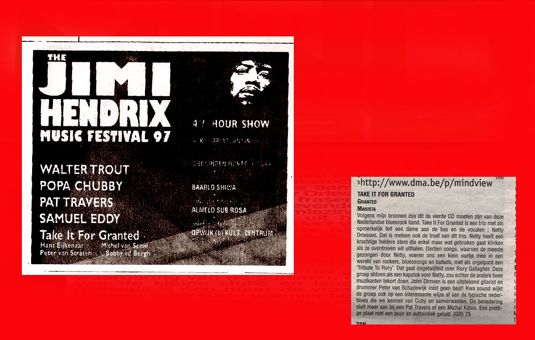 .....................many many times, Oor, Stage, Aardschok, Rif Raf, Big Twin, Mind View, Revu, Eindhovens Dagblad, Friesch Dablad, Groot Eindhoven, Haarlemmermeers Dagblad, Helmonds Dagblad, Traverse, Block, Jassepoes, Hendrixfanclub Germany, Udens Weekblad, Oostbrabant, Gitaar Plus, Gitarist, Volkskrant, Panorama, Alles op Tien,Travers, Aloha,de Sleutel Oss), Tubantia (Twente), de Brug, Leeuwarder Courant, Groovemaster, Dagblad Zaanstreek, Back to the Roots, Metal Maidens, Rockgirl, Kindamuzik, BV Popkrant, Bobtjeblues, Blues Das deutsche Bluesmagazin, Music in Belgium, Brabants Dagblad, Dienblad, Alternative ways, Track, De Stem, Backline, Brabant Pop, Musicmaker, Moors Magazine, GEZIEN-GEHOORD.NL, Blueszine, Maxazine, de Gelderlander, Popmagazine Heaven, Festivalinfo, File Under, and lots of local papers, alone or in combination with Take it for granted, Netty Driessen, Rosa King, Rob Hoeke, Sander Boes, Ben van de Wal, Bertus Borgers, Walter Trout, Ana Popovic, Jesse Gang, Ritchie Severijns, Eamonn Mccormack, Rob Snijders, Fred Hoogendoorn, Sjoerd van Bommel, Hans Dulfer, Peter van Schadewijk, Iwan Wijnen, Tony Peters, Bonki Bongaerts, Thijs van Leer, John Lagrand, Nicko Christiansen and many many more and lots of radio, local, national and all over the globe from Japan, Spain, UK, Denmark, Germany to the USA and back...............