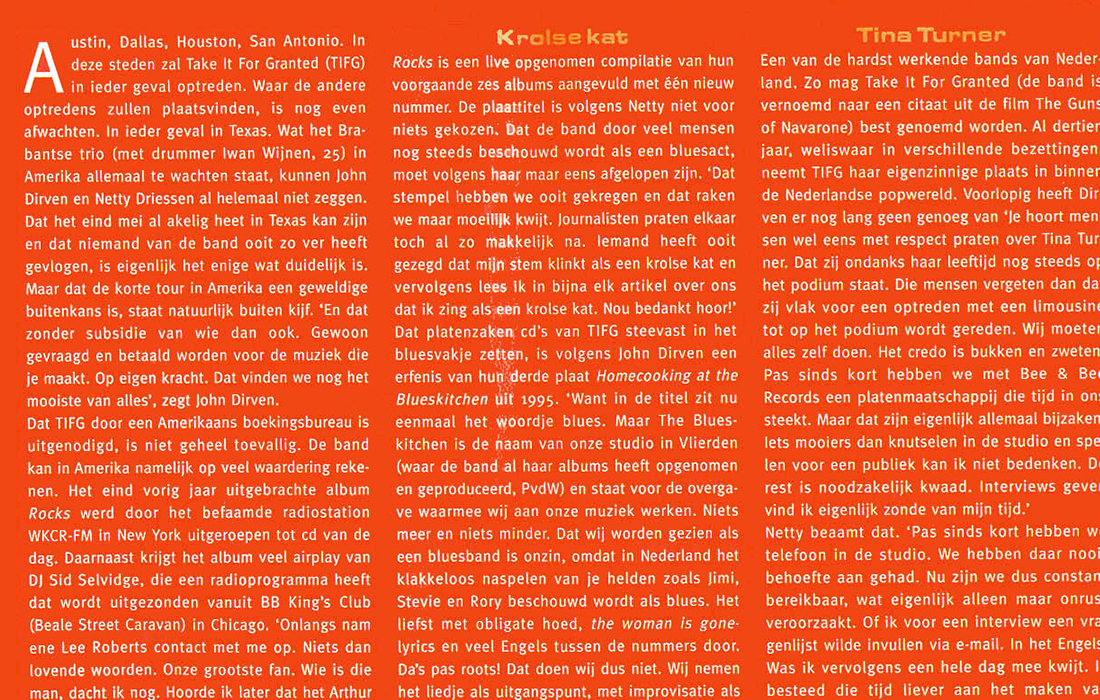 .....................many many times, Oor, Stage, Aardschok, Rif Raf, Big Twin, Mind View, Revu, Eindhovens Dagblad, Friesch Dablad, Groot Eindhoven, Haarlemmermeers Dagblad, Helmonds Dagblad, Traverse, Block, Jassepoes, Hendrixfanclub Germany, Udens Weekblad, Oostbrabant, Gitaar Plus, Gitarist, Volkskrant, Panorama, Alles op Tien,Travers, Aloha,de Sleutel Oss), Tubantia (Twente), de Brug, Leeuwarder Courant, Groovemaster, Dagblad Zaanstreek, Back to the Roots, Metal Maidens, Rockgirl, Kindamuzik, BV Popkrant, Bobtjeblues, Blues Das deutsche Bluesmagazin, Music in Belgium, Brabants Dagblad, Dienblad, Alternative ways, Track, De Stem, Backline, Brabant Pop, Musicmaker, Moors Magazine, GEZIEN-GEHOORD.NL, Blueszine, Maxazine, de Gelderlander, Popmagazine Heaven, Festivalinfo, File Under, and lots of local papers, alone or in combination with Take it for granted, Netty Driessen, Rosa King, Rob Hoeke, Sander Boes, Ben van de Wal, Bertus Borgers, Walter Trout, Ana Popovic, Jesse Gang, Ritchie Severijns, Eamonn Mccormack, Rob Snijders, Fred Hoogendoorn, Sjoerd van Bommel, Hans Dulfer, Peter van Schadewijk, Iwan Wijnen, Tony Peters, Bonki Bongaerts, Thijs van Leer, John Lagrand, Nicko Christiansen and many many more and lots of radio, local, national and all over the globe from Japan, Spain, UK, Denmark, Germany to the USA and back...............