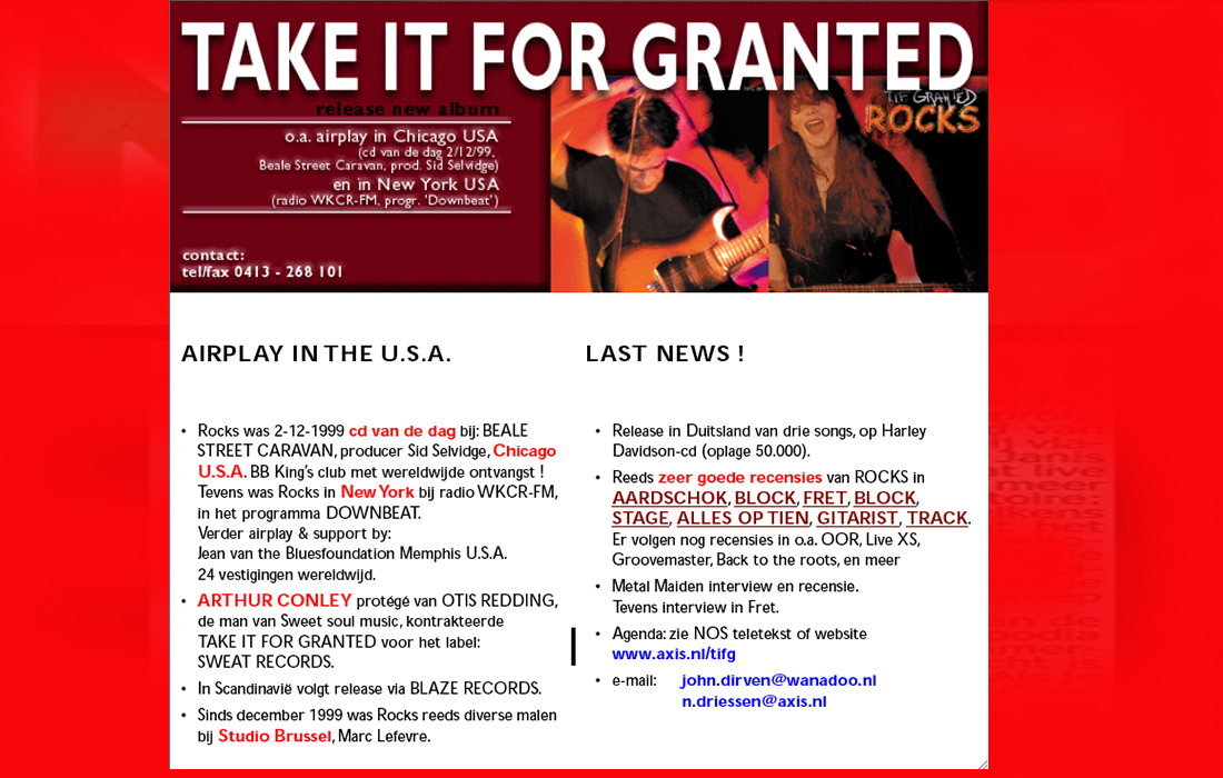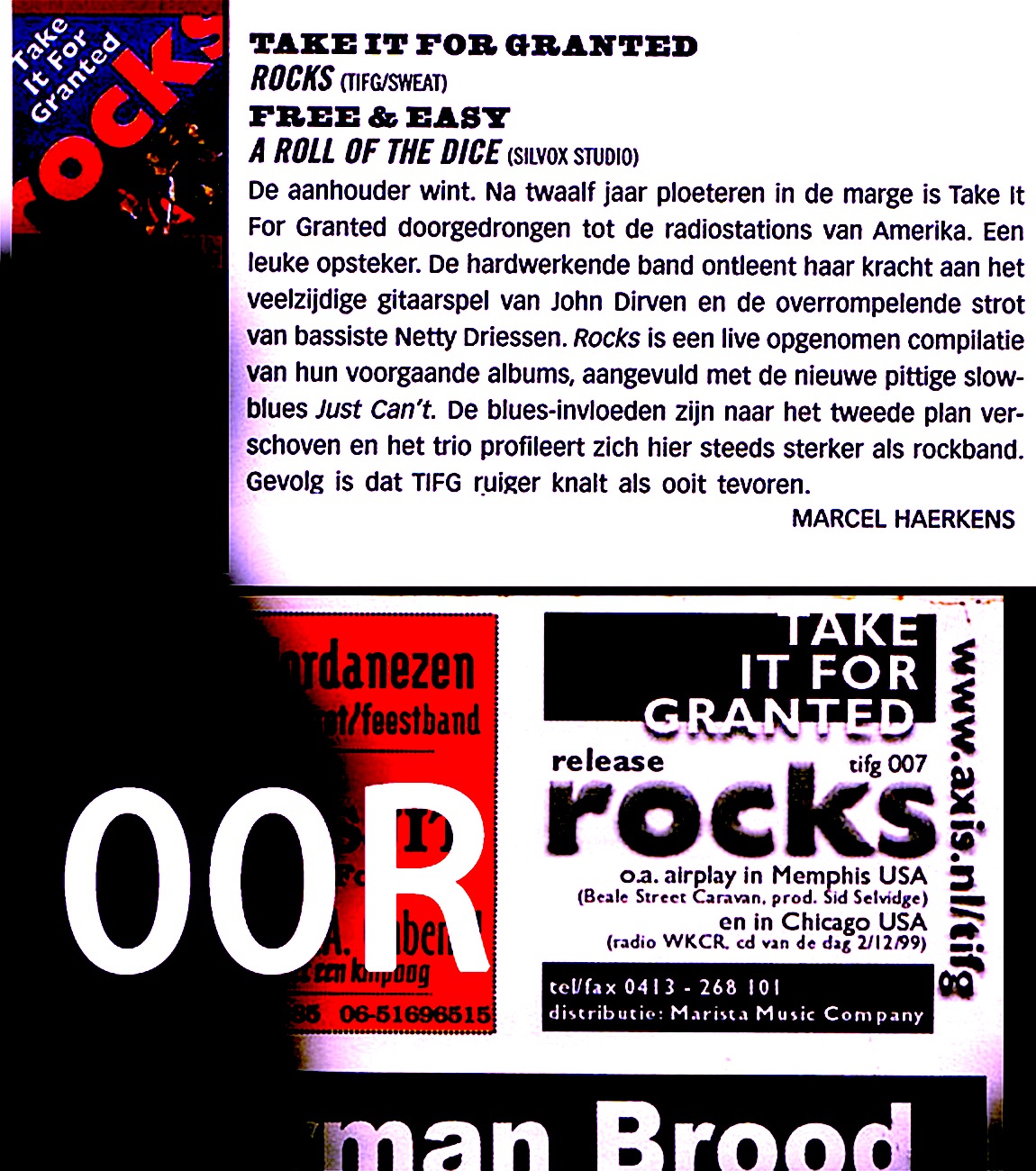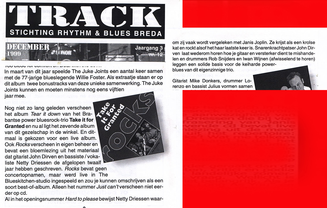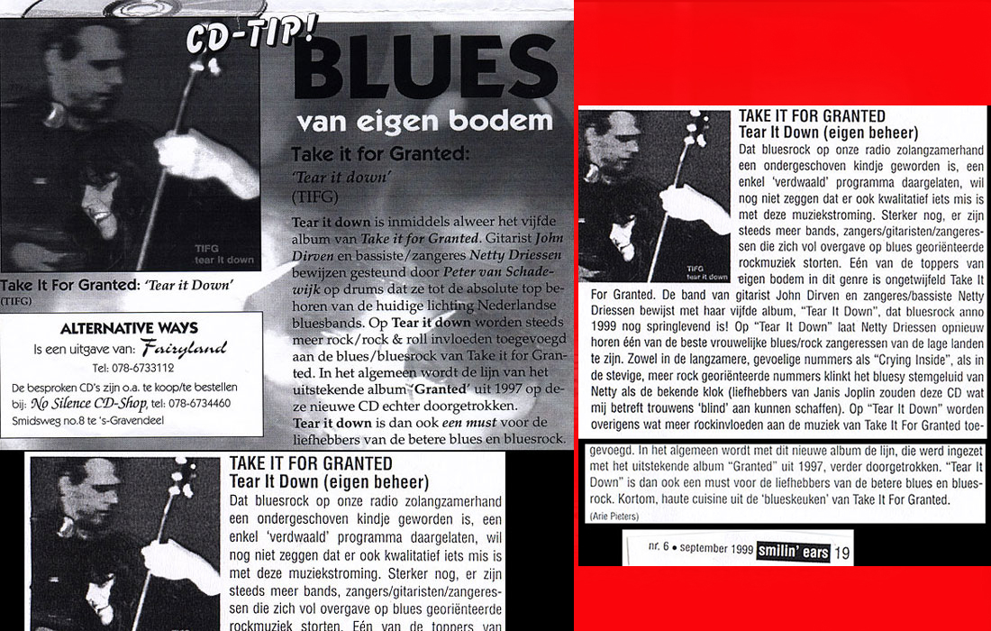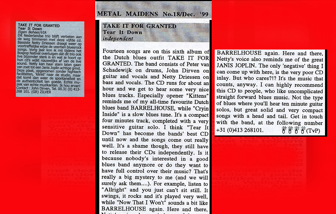 .....................many many times, Oor, Stage, Aardschok, Rif Raf, Big Twin, Mind View, Revu, Eindhovens Dagblad, Friesch Dablad, Groot Eindhoven, Haarlemmermeers Dagblad, Helmonds Dagblad, Traverse, Block, Jassepoes, Hendrixfanclub Germany, Udens Weekblad, Oostbrabant, Gitaar Plus, Gitarist, Volkskrant, Panorama, Alles op Tien,Travers, Aloha,de Sleutel Oss), Tubantia (Twente), de Brug, Leeuwarder Courant, Groovemaster, Dagblad Zaanstreek, Back to the Roots, Metal Maidens, Rockgirl, Kindamuzik, BV Popkrant, Bobtjeblues, Blues Das deutsche Bluesmagazin, Music in Belgium, Brabants Dagblad, Dienblad, Alternative ways, Track, De Stem, Backline, Brabant Pop, Musicmaker, Moors Magazine, GEZIEN-GEHOORD.NL, Blueszine, Maxazine, de Gelderlander, Popmagazine Heaven, Festivalinfo, File Under, and lots of local papers, alone or in combination with Take it for granted, Netty Driessen, Rosa King, Rob Hoeke, Sander Boes, Ben van de Wal, Bertus Borgers, Walter Trout, Ana Popovic, Jesse Gang, Ritchie Severijns, Eamonn Mccormack, Rob Snijders, Fred Hoogendoorn, Sjoerd van Bommel, Hans Dulfer, Peter van Schadewijk, Iwan Wijnen, Tony Peters, Bonki Bongaerts, Thijs van Leer, John Lagrand, Nicko Christiansen and many many more and lots of radio, local, national and all over the globe from Japan, Spain, UK, Denmark, Germany to the USA and back...............