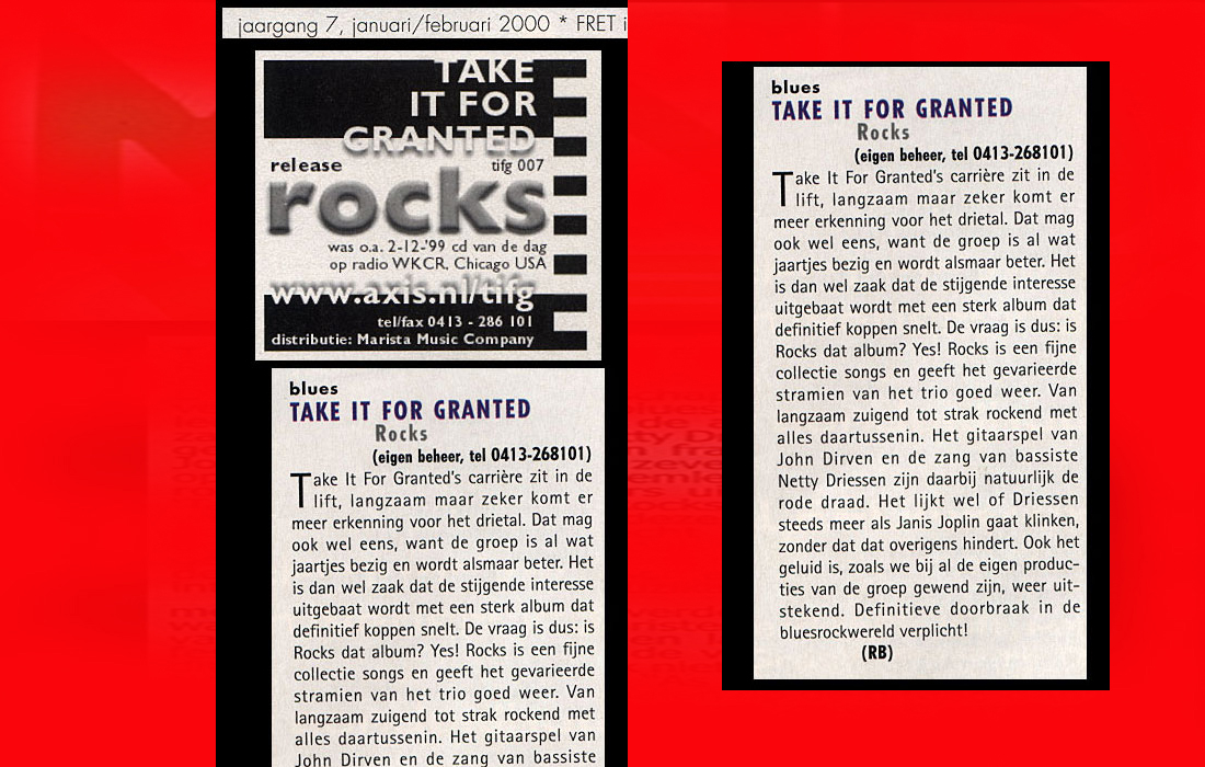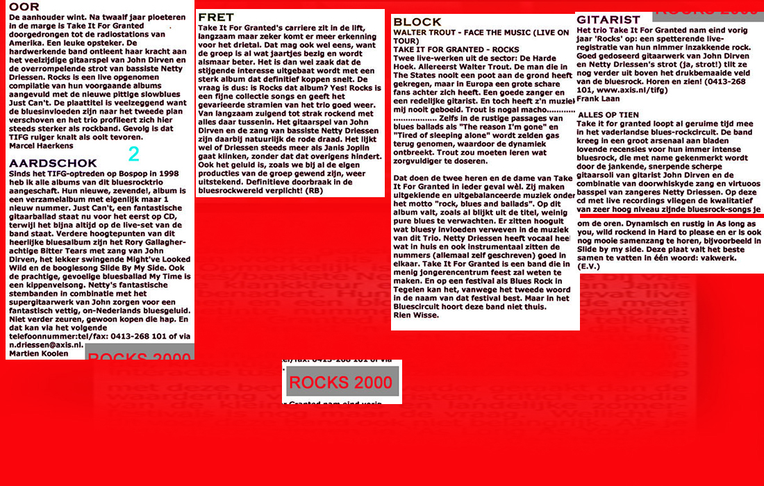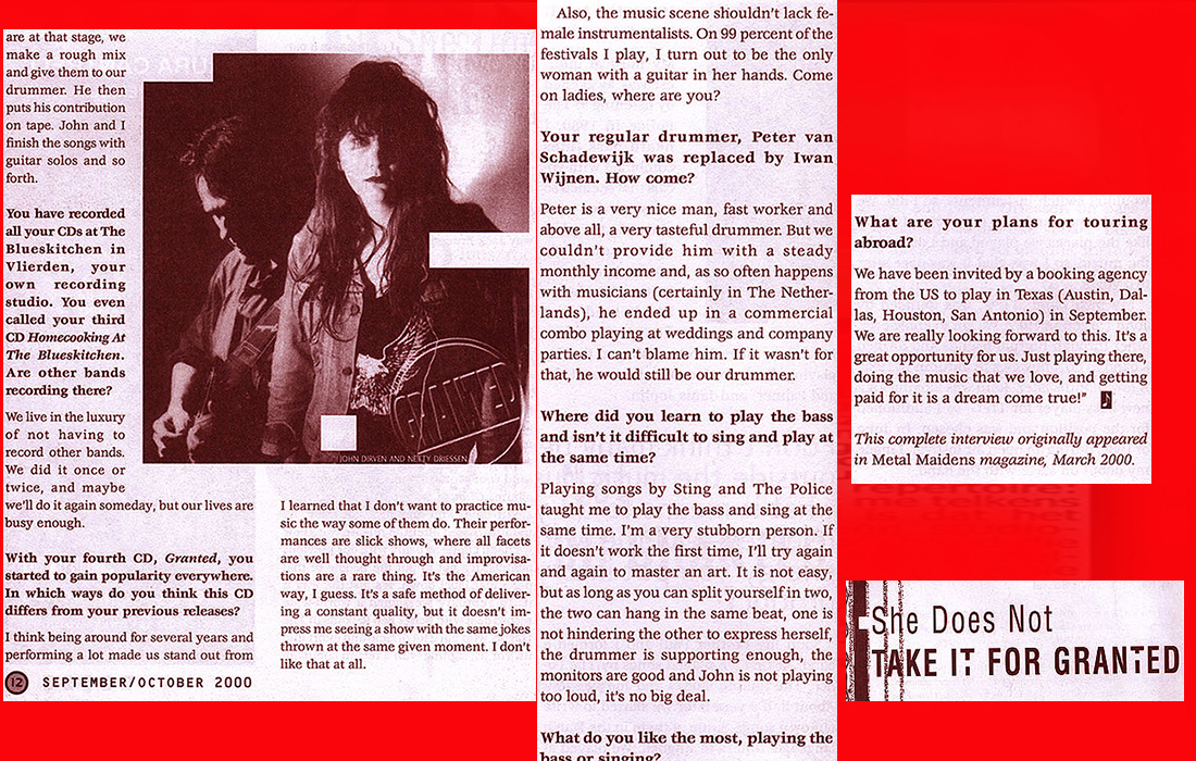 .....................many many times, Oor, Stage, Aardschok, Rif Raf, Big Twin, Mind View, Revu, Eindhovens Dagblad, Friesch Dablad, Groot Eindhoven, Haarlemmermeers Dagblad, Helmonds Dagblad, Traverse, Block, Jassepoes, Hendrixfanclub Germany, Udens Weekblad, Oostbrabant, Gitaar Plus, Gitarist, Volkskrant, Panorama, Alles op Tien,Travers, Aloha,de Sleutel Oss), Tubantia (Twente), de Brug, Leeuwarder Courant, Groovemaster, Dagblad Zaanstreek, Back to the Roots, Metal Maidens, Rockgirl, Kindamuzik, BV Popkrant, Bobtjeblues, Blues Das deutsche Bluesmagazin, Music in Belgium, Brabants Dagblad, Dienblad, Alternative ways, Track, De Stem, Backline, Brabant Pop, Musicmaker, Moors Magazine, GEZIEN-GEHOORD.NL, Blueszine, Maxazine, de Gelderlander, Popmagazine Heaven, Festivalinfo, File Under, and lots of local papers, alone or in combination with Take it for granted, Netty Driessen, Rosa King, Rob Hoeke, Sander Boes, Ben van de Wal, Bertus Borgers, Walter Trout, Ana Popovic, Jesse Gang, Ritchie Severijns, Eamonn Mccormack, Rob Snijders, Fred Hoogendoorn, Sjoerd van Bommel, Hans Dulfer, Peter van Schadewijk, Iwan Wijnen, Tony Peters, Bonki Bongaerts, Thijs van Leer, John Lagrand, Nicko Christiansen and many many more and lots of radio, local, national and all over the globe from Japan, Spain, UK, Denmark, Germany to the USA and back...............