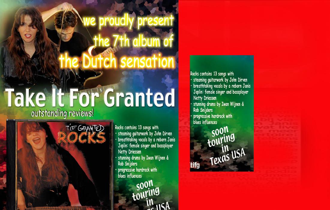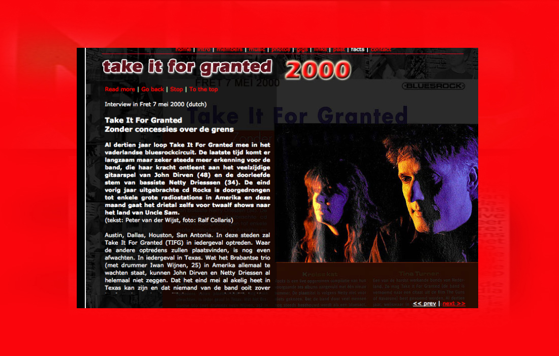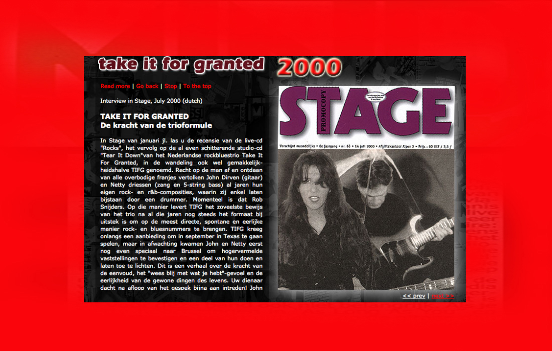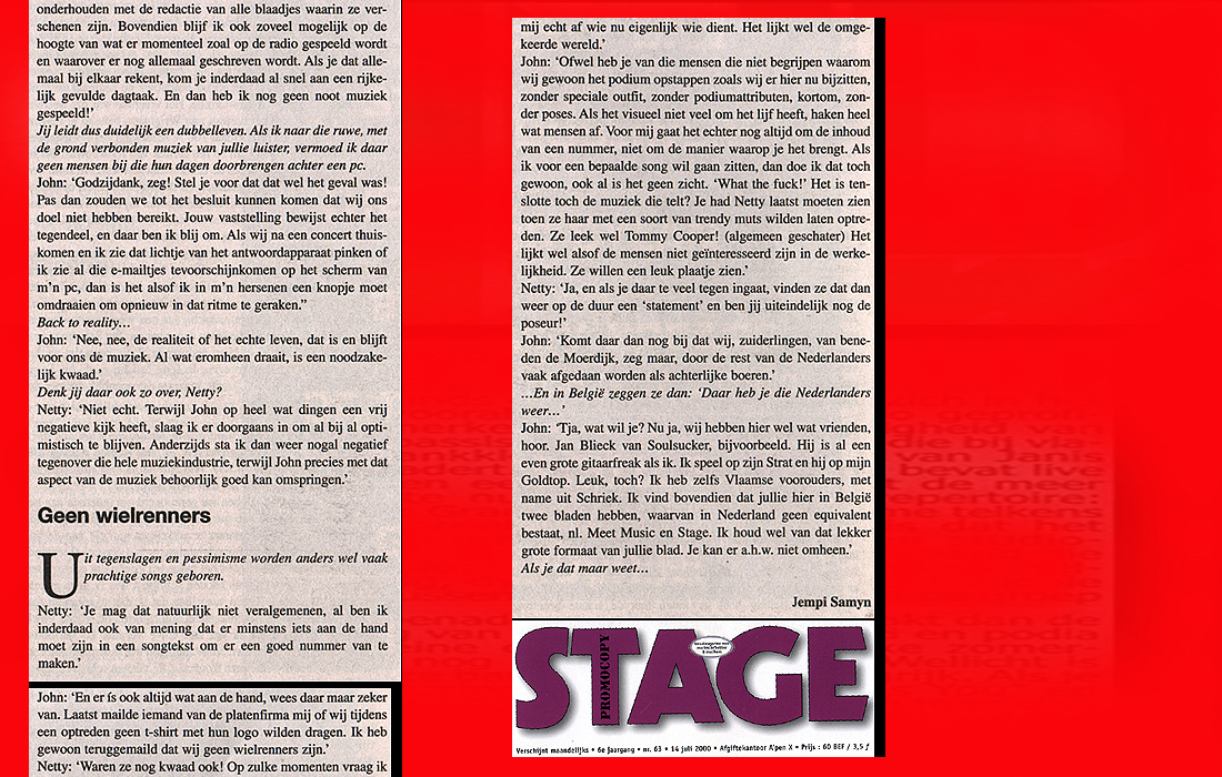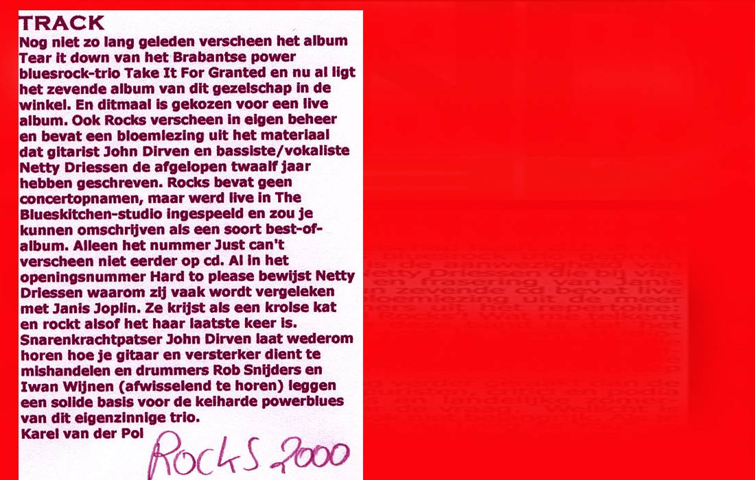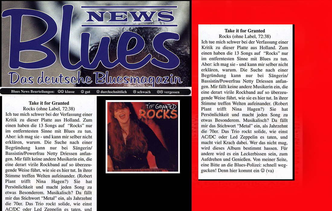 .....................many many times, Oor, Stage, Aardschok, Rif Raf, Big Twin, Mind View, Revu, Eindhovens Dagblad, Friesch Dablad, Groot Eindhoven, Haarlemmermeers Dagblad, Helmonds Dagblad, Traverse, Block, Jassepoes, Hendrixfanclub Germany, Udens Weekblad, Oostbrabant, Gitaar Plus, Gitarist, Volkskrant, Panorama, Alles op Tien,Travers, Aloha,de Sleutel Oss), Tubantia (Twente), de Brug, Leeuwarder Courant, Groovemaster, Dagblad Zaanstreek, Back to the Roots, Metal Maidens, Rockgirl, Kindamuzik, BV Popkrant, Bobtjeblues, Blues Das deutsche Bluesmagazin, Music in Belgium, Brabants Dagblad, Dienblad, Alternative ways, Track, De Stem, Backline, Brabant Pop, Musicmaker, Moors Magazine, GEZIEN-GEHOORD.NL, Blueszine, Maxazine, de Gelderlander, Popmagazine Heaven, Festivalinfo, File Under, and lots of local papers, alone or in combination with Take it for granted, Netty Driessen, Rosa King, Rob Hoeke, Sander Boes, Ben van de Wal, Bertus Borgers, Walter Trout, Ana Popovic, Jesse Gang, Ritchie Severijns, Eamonn Mccormack, Rob Snijders, Fred Hoogendoorn, Sjoerd van Bommel, Hans Dulfer, Peter van Schadewijk, Iwan Wijnen, Tony Peters, Bonki Bongaerts, Thijs van Leer, John Lagrand, Nicko Christiansen and many many more and lots of radio, local, national and all over the globe from Japan, Spain, UK, Denmark, Germany to the USA and back...............