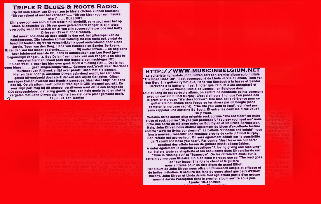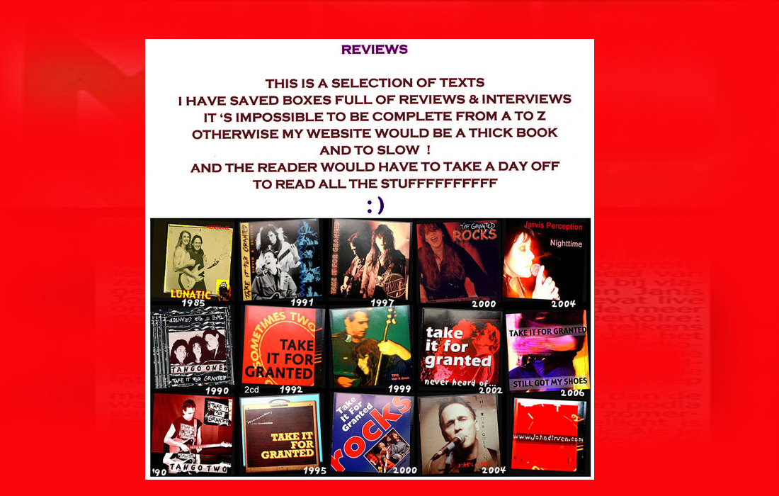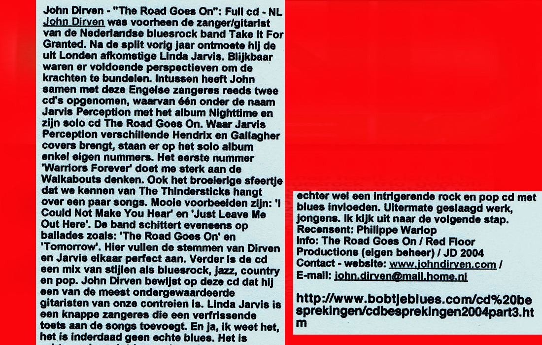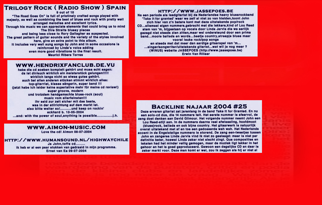 .....................many many times, Oor, Stage, Aardschok, Rif Raf, Big Twin, Mind View, Revu, Eindhovens Dagblad, Friesch Dablad, Groot Eindhoven, Haarlemmermeers Dagblad, Helmonds Dagblad, Traverse, Block, Jassepoes, Hendrixfanclub Germany, Udens Weekblad, Oostbrabant, Gitaar Plus, Gitarist, Volkskrant, Panorama, Alles op Tien,Travers, Aloha,de Sleutel Oss), Tubantia (Twente), de Brug, Leeuwarder Courant, Groovemaster, Dagblad Zaanstreek, Back to the Roots, Metal Maidens, Rockgirl, Kindamuzik, BV Popkrant, Bobtjeblues, Blues Das deutsche Bluesmagazin, Music in Belgium, Brabants Dagblad, Dienblad, Alternative ways, Track, De Stem, Backline, Brabant Pop, Musicmaker, Moors Magazine, GEZIEN-GEHOORD.NL, Blueszine, Maxazine, de Gelderlander, Popmagazine Heaven, Festivalinfo, File Under, and lots of local papers, alone or in combination with Take it for granted, Netty Driessen, Rosa King, Rob Hoeke, Sander Boes, Ben van de Wal, Bertus Borgers, Walter Trout, Ana Popovic, Jesse Gang, Ritchie Severijns, Eamonn Mccormack, Rob Snijders, Fred Hoogendoorn, Sjoerd van Bommel, Hans Dulfer, Peter van Schadewijk, Iwan Wijnen, Tony Peters, Bonki Bongaerts, Thijs van Leer, John Lagrand, Nicko Christiansen and many many more and lots of radio, local, national and all over the globe from Japan, Spain, UK, Denmark, Germany to the USA and back...............