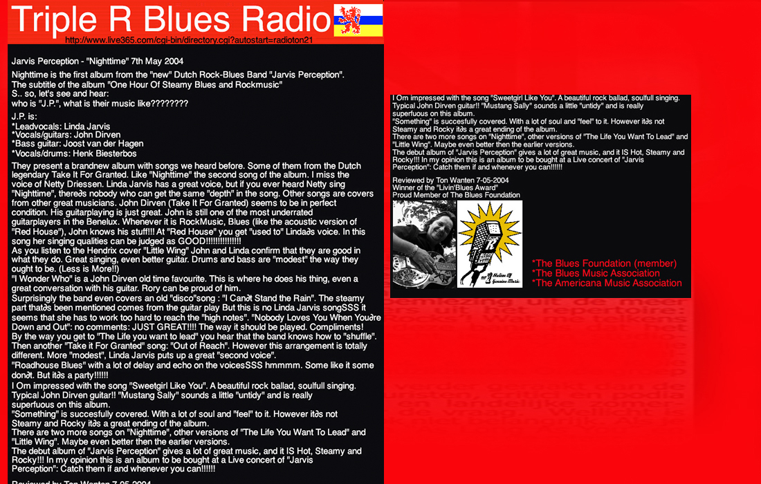 .....................many many times, Oor, Stage, Aardschok, Rif Raf, Big Twin, Mind View, Revu, Eindhovens Dagblad, Friesch Dablad, Groot Eindhoven, Haarlemmermeers Dagblad, Helmonds Dagblad, Traverse, Block, Jassepoes, Hendrixfanclub Germany, Udens Weekblad, Oostbrabant, Gitaar Plus, Gitarist, Volkskrant, Panorama, Alles op Tien,Travers, Aloha,de Sleutel Oss), Tubantia (Twente), de Brug, Leeuwarder Courant, Groovemaster, Dagblad Zaanstreek, Back to the Roots, Metal Maidens, Rockgirl, Kindamuzik, BV Popkrant, Bobtjeblues, Blues Das deutsche Bluesmagazin, Music in Belgium, Brabants Dagblad, Dienblad, Alternative ways, Track, De Stem, Backline, Brabant Pop, Musicmaker, Moors Magazine, GEZIEN-GEHOORD.NL, Blueszine, Maxazine, de Gelderlander, Popmagazine Heaven, Festivalinfo, File Under, and lots of local papers, alone or in combination with Take it for granted, Netty Driessen, Rosa King, Rob Hoeke, Sander Boes, Ben van de Wal, Bertus Borgers, Walter Trout, Ana Popovic, Jesse Gang, Ritchie Severijns, Eamonn Mccormack, Rob Snijders, Fred Hoogendoorn, Sjoerd van Bommel, Hans Dulfer, Peter van Schadewijk, Iwan Wijnen, Tony Peters, Bonki Bongaerts, Thijs van Leer, John Lagrand, Nicko Christiansen and many many more and lots of radio, local, national and all over the globe from Japan, Spain, UK, Denmark, Germany to the USA and back...............