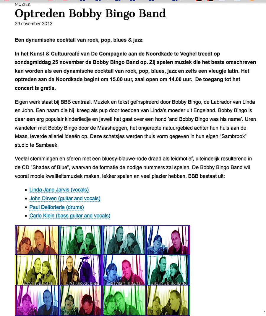 .....................many many times, Oor, Stage, Aardschok, Rif Raf, Big Twin, Mind View, Revu, Eindhovens Dagblad, Friesch Dablad, Groot Eindhoven, Haarlemmermeers Dagblad, Helmonds Dagblad, Traverse, Block, Jassepoes, Hendrixfanclub Germany, Udens Weekblad, Oostbrabant, Gitaar Plus, Gitarist, Volkskrant, Panorama, Alles op Tien,Travers, Aloha,de Sleutel Oss), Tubantia (Twente), de Brug, Leeuwarder Courant, Groovemaster, Dagblad Zaanstreek, Back to the Roots, Metal Maidens, Rockgirl, Kindamuzik, BV Popkrant, Bobtjeblues, Blues Das deutsche Bluesmagazin, Music in Belgium, Brabants Dagblad, Dienblad, Alternative ways, Track, De Stem, Backline, Brabant Pop, Musicmaker, Moors Magazine, GEZIEN-GEHOORD.NL, Blueszine, Maxazine, de Gelderlander, Popmagazine Heaven, Festivalinfo, File Under, and lots of local papers, alone or in combination with Take it for granted, Netty Driessen, Rosa King, Rob Hoeke, Sander Boes, Ben van de Wal, Bertus Borgers, Walter Trout, Ana Popovic, Jesse Gang, Ritchie Severijns, Eamonn Mccormack, Rob Snijders, Fred Hoogendoorn, Sjoerd van Bommel, Hans Dulfer, Peter van Schadewijk, Iwan Wijnen, Tony Peters, Bonki Bongaerts, Thijs van Leer, John Lagrand, Nicko Christiansen and many many more and lots of radio, local, national and all over the globe from Japan, Spain, UK, Denmark, Germany to the USA and back...............