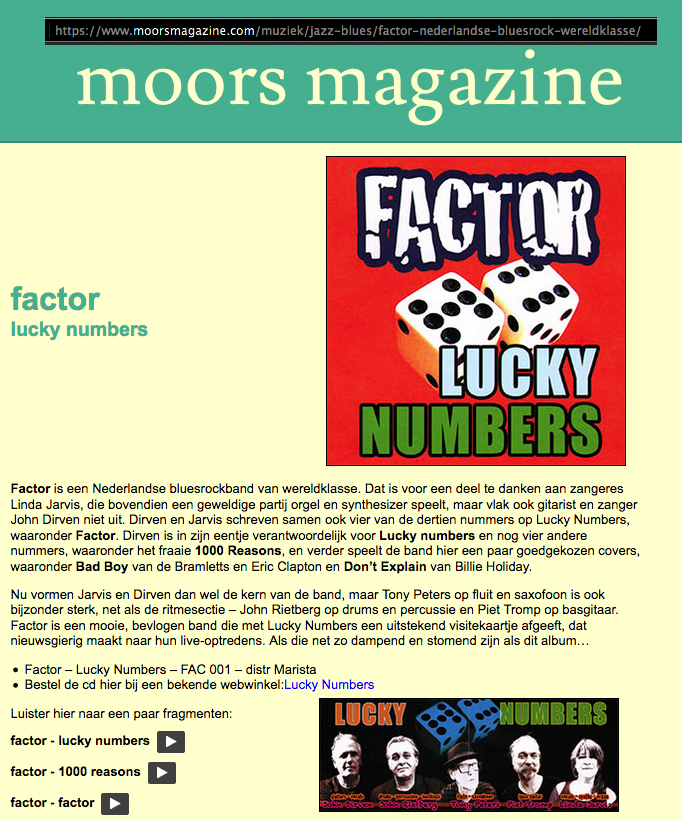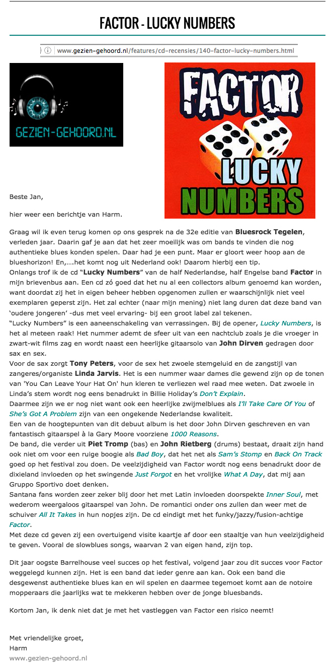 .....................many many times, Oor, Stage, Aardschok, Rif Raf, Big Twin, Mind View, Revu, Eindhovens Dagblad, Friesch Dablad, Groot Eindhoven, Haarlemmermeers Dagblad, Helmonds Dagblad, Traverse, Block, Jassepoes, Hendrixfanclub Germany, Udens Weekblad, Oostbrabant, Gitaar Plus, Gitarist, Volkskrant, Panorama, Alles op Tien,Travers, Aloha,de Sleutel Oss), Tubantia (Twente), de Brug, Leeuwarder Courant, Groovemaster, Dagblad Zaanstreek, Back to the Roots, Metal Maidens, Rockgirl, Kindamuzik, BV Popkrant, Bobtjeblues, Blues Das deutsche Bluesmagazin, Music in Belgium, Brabants Dagblad, Dienblad, Alternative ways, Track, De Stem, Backline, Brabant Pop, Musicmaker, Moors Magazine, GEZIEN-GEHOORD.NL, Blueszine, Maxazine, de Gelderlander, Popmagazine Heaven, Festivalinfo, File Under, Tubantia and lots of local papers, alone or in combination with Take it for granted, Netty Driessen, Rosa King, Rob Hoeke, Sander Boes, Ben van de Wal, Bertus Borgers, Walter Trout, Ana Popovic, Jesse Gang, Ritchie Severijns, Eamonn Mccormack, Rob Snijders, Fred Hoogendoorn, Sjoerd van Bommel, Hans Dulfer, Peter van Schadewijk, Iwan Wijnen, Tony Peters, Bonki Bongaerts, Thijs van Leer, John Lagrand, Nicko Christiansen and many many more and lots of radio, local, national