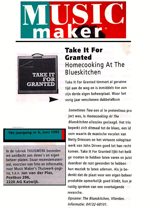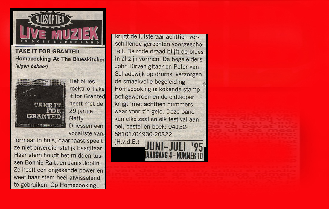 .....................many many times, Oor, Stage, Aardschok, Rif Raf, Big Twin, Mind View, Revu, Eindhovens Dagblad, Friesch Dablad, Groot Eindhoven, Haarlemmermeers Dagblad, Helmonds Dagblad, Traverse, Block, Jassepoes, Hendrixfanclub Germany, Udens Weekblad, Oostbrabant, Gitaar Plus, Gitarist, Volkskrant, Panorama, Alles op Tien,Travers, Aloha,de Sleutel Oss), Tubantia (Twente), de Brug, Leeuwarder Courant, Groovemaster, Dagblad Zaanstreek, Back to the Roots, Metal Maidens, Rockgirl, Kindamuzik, BV Popkrant, Bobtjeblues, Blues Das deutsche Bluesmagazin, Music in Belgium, Brabants Dagblad, Dienblad, Alternative ways, Track, De Stem, Backline, Brabant Pop, Musicmaker, Moors Magazine, GEZIEN-GEHOORD.NL, Blueszine, Maxazine, de Gelderlander, Popmagazine Heaven, Festivalinfo, File Under, and lots of local papers, alone or in combination with Take it for granted, Netty Driessen, Rosa King, Rob Hoeke, Sander Boes, Ben van de Wal, Bertus Borgers, Walter Trout, Ana Popovic, Jesse Gang, Ritchie Severijns, Eamonn Mccormack, Rob Snijders, Fred Hoogendoorn, Sjoerd van Bommel, Hans Dulfer, Peter van Schadewijk, Iwan Wijnen, Tony Peters, Bonki Bongaerts, Thijs van Leer, John Lagrand, Nicko Christiansen and many many more and lots of radio, local, national and all over the globe from Japan, Spain, UK, Denmark, Germany to the USA and back...............