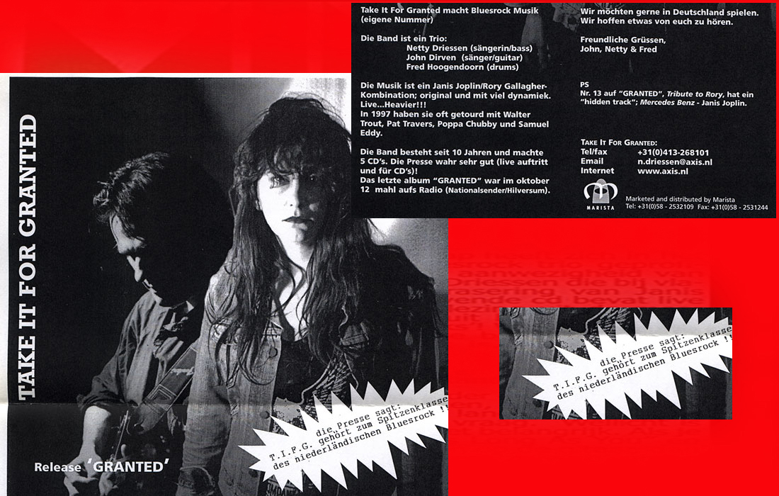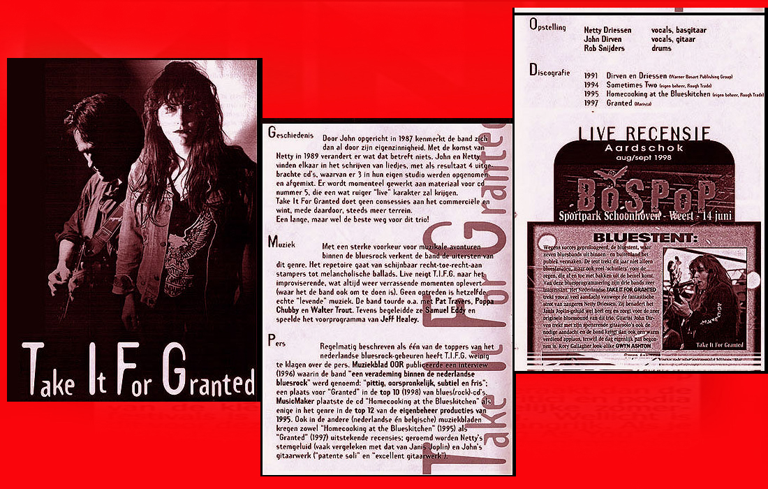 .....................many many times, Oor, Stage, Aardschok, Rif Raf, Big Twin, Mind View, Revu, Eindhovens Dagblad, Friesch Dablad, Groot Eindhoven, Haarlemmermeers Dagblad, Helmonds Dagblad, Traverse, Block, Jassepoes, Hendrixfanclub Germany, Udens Weekblad, Oostbrabant, Gitaar Plus, Gitarist, Volkskrant, Panorama, Alles op Tien,Travers, Aloha,de Sleutel Oss), Tubantia (Twente), de Brug, Leeuwarder Courant, Groovemaster, Dagblad Zaanstreek, Back to the Roots, Metal Maidens, Rockgirl, Kindamuzik, BV Popkrant, Bobtjeblues, Blues Das deutsche Bluesmagazin, Music in Belgium, Brabants Dagblad, Dienblad, Alternative ways, Track, De Stem, Backline, Brabant Pop, Musicmaker, Moors Magazine, GEZIEN-GEHOORD.NL, Blueszine, Maxazine, de Gelderlander, Popmagazine Heaven, Festivalinfo, File Under, and lots of local papers, alone or in combination with Take it for granted, Netty Driessen, Rosa King, Rob Hoeke, Sander Boes, Ben van de Wal, Bertus Borgers, Walter Trout, Ana Popovic, Jesse Gang, Ritchie Severijns, Eamonn Mccormack, Rob Snijders, Fred Hoogendoorn, Sjoerd van Bommel, Hans Dulfer, Peter van Schadewijk, Iwan Wijnen, Tony Peters, Bonki Bongaerts, Thijs van Leer, John Lagrand, Nicko Christiansen and many many more and lots of radio, local, national and all over the globe from Japan, Spain, UK, Denmark, Germany to the USA and back...............