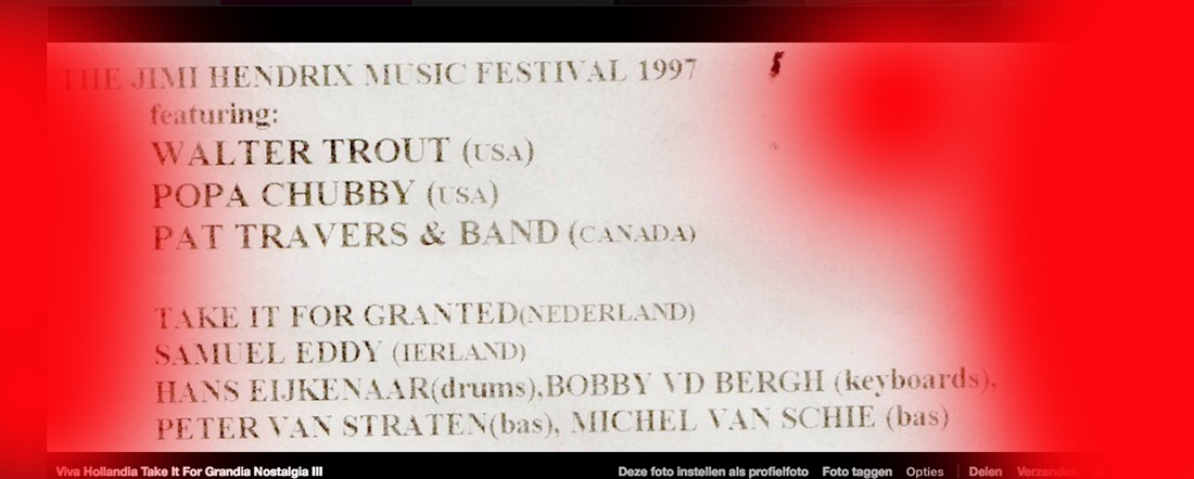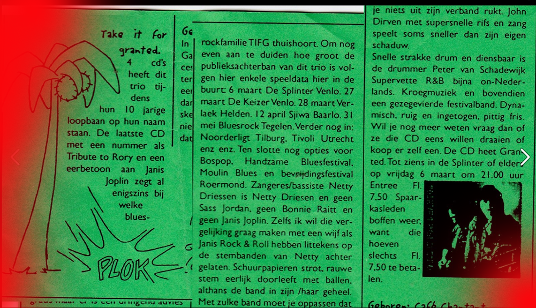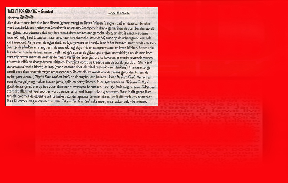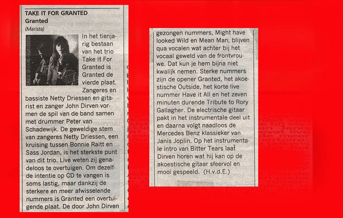 .....................many many times, Oor, Stage, Aardschok, Rif Raf, Big Twin, Mind View, Revu, Eindhovens Dagblad, Friesch Dablad, Groot Eindhoven, Haarlemmermeers Dagblad, Helmonds Dagblad, Traverse, Block, Jassepoes, Hendrixfanclub Germany, Udens Weekblad, Oostbrabant, Gitaar Plus, Gitarist, Volkskrant, Panorama, Alles op Tien,Travers, Aloha,de Sleutel Oss), Tubantia (Twente), de Brug, Leeuwarder Courant, Groovemaster, Dagblad Zaanstreek, Back to the Roots, Metal Maidens, Rockgirl, Kindamuzik, BV Popkrant, Bobtjeblues, Blues Das deutsche Bluesmagazin, Music in Belgium, Brabants Dagblad, Dienblad, Alternative ways, Track, De Stem, Backline, Brabant Pop, Musicmaker, Moors Magazine, GEZIEN-GEHOORD.NL, Blueszine, Maxazine, de Gelderlander, Popmagazine Heaven, Festivalinfo, File Under, and lots of local papers, alone or in combination with Take it for granted, Netty Driessen, Rosa King, Rob Hoeke, Sander Boes, Ben van de Wal, Bertus Borgers, Walter Trout, Ana Popovic, Jesse Gang, Ritchie Severijns, Eamonn Mccormack, Rob Snijders, Fred Hoogendoorn, Sjoerd van Bommel, Hans Dulfer, Peter van Schadewijk, Iwan Wijnen, Tony Peters, Bonki Bongaerts, Thijs van Leer, John Lagrand, Nicko Christiansen and many many more and lots of radio, local, national and all over the globe from Japan, Spain, UK, Denmark, Germany to the USA and back...............