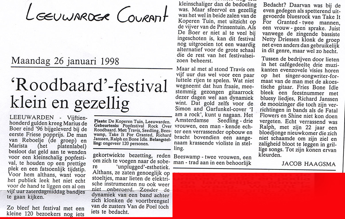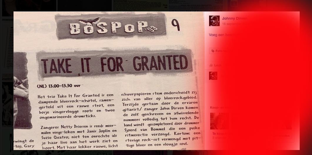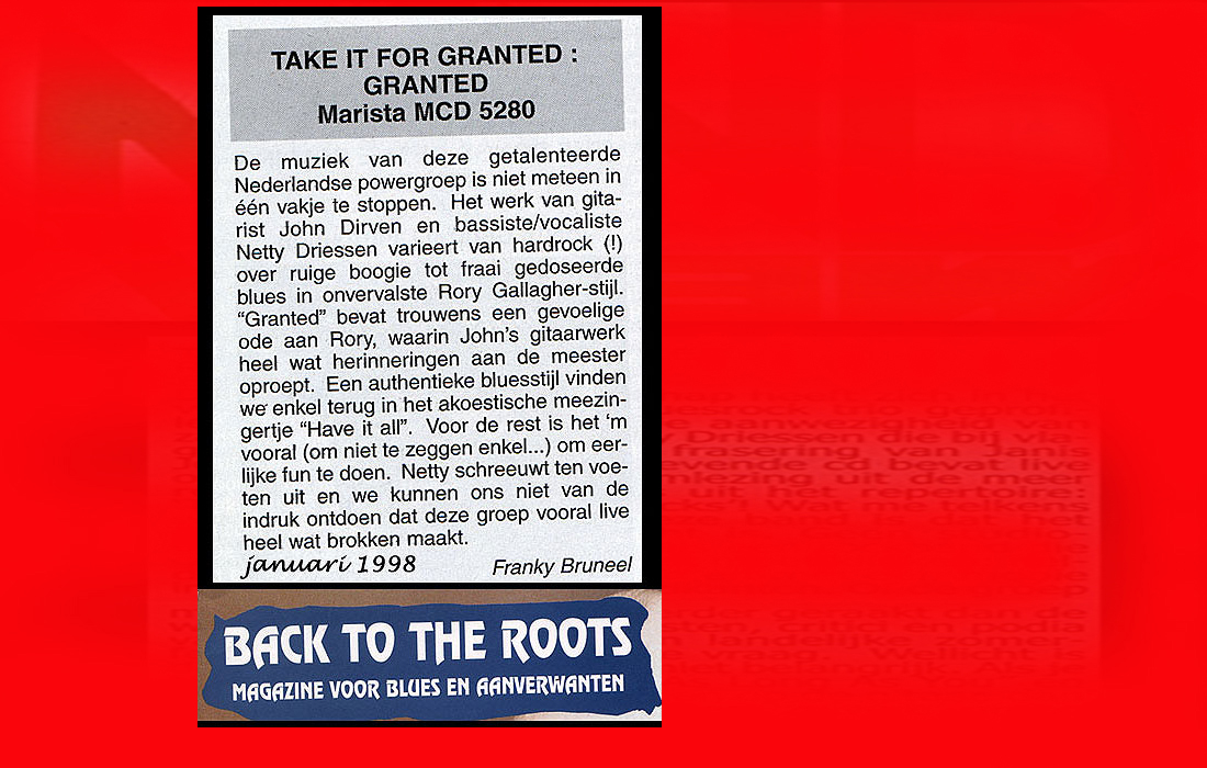 .....................many many times, Oor, Stage, Aardschok, Rif Raf, Big Twin, Mind View, Revu, Eindhovens Dagblad, Friesch Dablad, Groot Eindhoven, Haarlemmermeers Dagblad, Helmonds Dagblad, Traverse, Block, Jassepoes, Hendrixfanclub Germany, Udens Weekblad, Oostbrabant, Gitaar Plus, Gitarist, Volkskrant, Panorama, Alles op Tien,Travers, Aloha,de Sleutel Oss), Tubantia (Twente), de Brug, Leeuwarder Courant, Groovemaster, Dagblad Zaanstreek, Back to the Roots, Metal Maidens, Rockgirl, Kindamuzik, BV Popkrant, Bobtjeblues, Blues Das deutsche Bluesmagazin, Music in Belgium, Brabants Dagblad, Dienblad, Alternative ways, Track, De Stem, Backline, Brabant Pop, Musicmaker, Moors Magazine, GEZIEN-GEHOORD.NL, Blueszine, Maxazine, de Gelderlander, Popmagazine Heaven, Festivalinfo, File Under, and lots of local papers, alone or in combination with Take it for granted, Netty Driessen, Rosa King, Rob Hoeke, Sander Boes, Ben van de Wal, Bertus Borgers, Walter Trout, Ana Popovic, Jesse Gang, Ritchie Severijns, Eamonn Mccormack, Rob Snijders, Fred Hoogendoorn, Sjoerd van Bommel, Hans Dulfer, Peter van Schadewijk, Iwan Wijnen, Tony Peters, Bonki Bongaerts, Thijs van Leer, John Lagrand, Nicko Christiansen and many many more and lots of radio, local, national and all over the globe from Japan, Spain, UK, Denmark, Germany to the USA and back...............