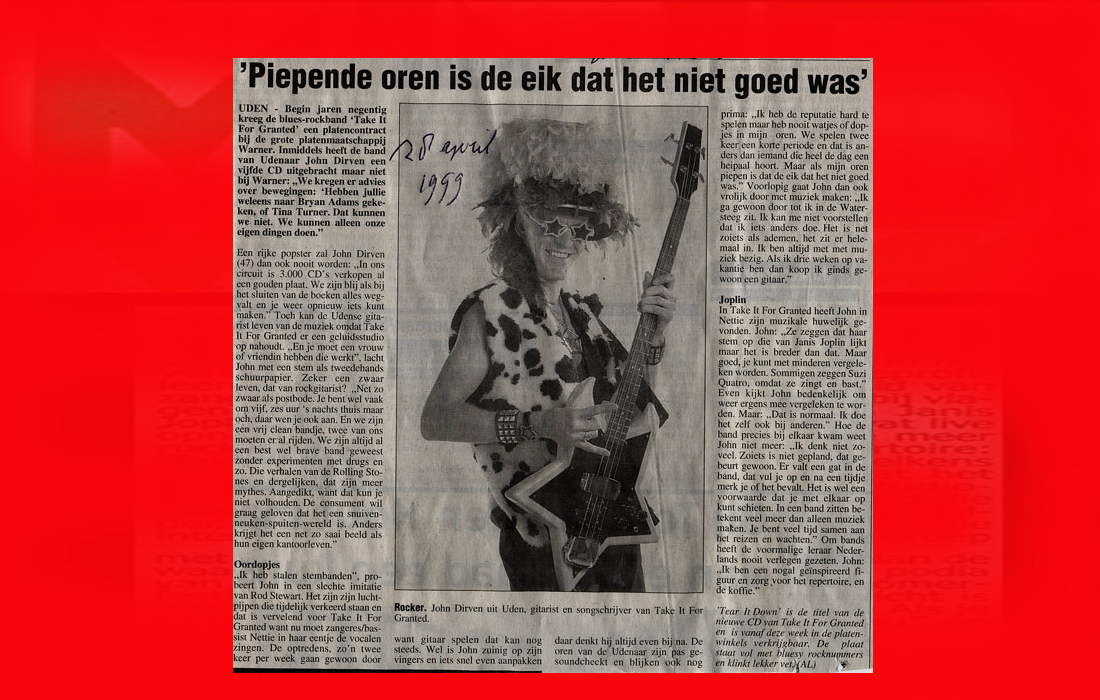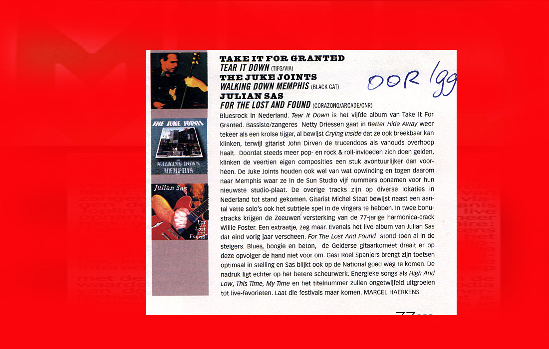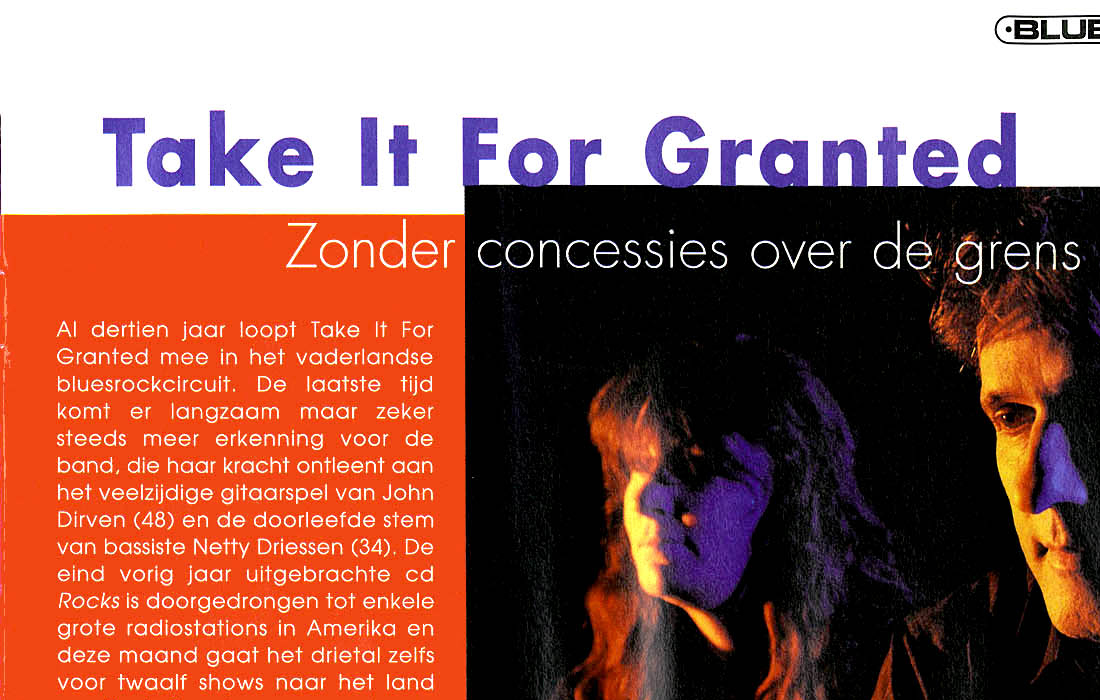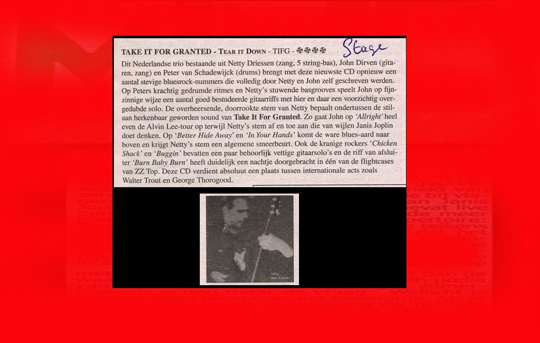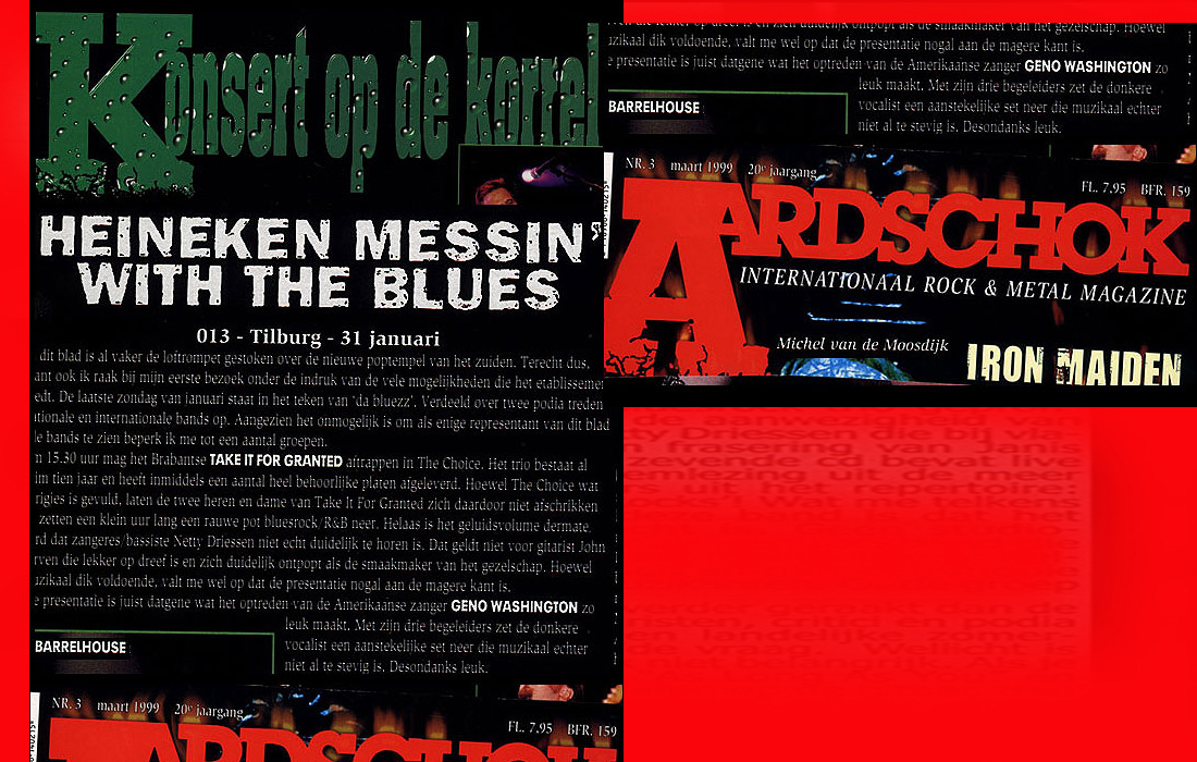 .....................many many times, Oor, Stage, Aardschok, Rif Raf, Big Twin, Mind View, Revu, Eindhovens Dagblad, Friesch Dablad, Groot Eindhoven, Haarlemmermeers Dagblad, Helmonds Dagblad, Traverse, Block, Jassepoes, Hendrixfanclub Germany, Udens Weekblad, Oostbrabant, Gitaar Plus, Gitarist, Volkskrant, Panorama, Alles op Tien,Travers, Aloha,de Sleutel Oss), Tubantia (Twente), de Brug, Leeuwarder Courant, Groovemaster, Dagblad Zaanstreek, Back to the Roots, Metal Maidens, Rockgirl, Kindamuzik, BV Popkrant, Bobtjeblues, Blues Das deutsche Bluesmagazin, Music in Belgium, Brabants Dagblad, Dienblad, Alternative ways, Track, De Stem, Backline, Brabant Pop, Musicmaker, Moors Magazine, GEZIEN-GEHOORD.NL, Blueszine, Maxazine, de Gelderlander, Popmagazine Heaven, Festivalinfo, File Under, and lots of local papers, alone or in combination with Take it for granted, Netty Driessen, Rosa King, Rob Hoeke, Sander Boes, Ben van de Wal, Bertus Borgers, Walter Trout, Ana Popovic, Jesse Gang, Ritchie Severijns, Eamonn Mccormack, Rob Snijders, Fred Hoogendoorn, Sjoerd van Bommel, Hans Dulfer, Peter van Schadewijk, Iwan Wijnen, Tony Peters, Bonki Bongaerts, Thijs van Leer, John Lagrand, Nicko Christiansen and many many more and lots of radio, local, national and all over the globe from Japan, Spain, UK, Denmark, Germany to the USA and back...............