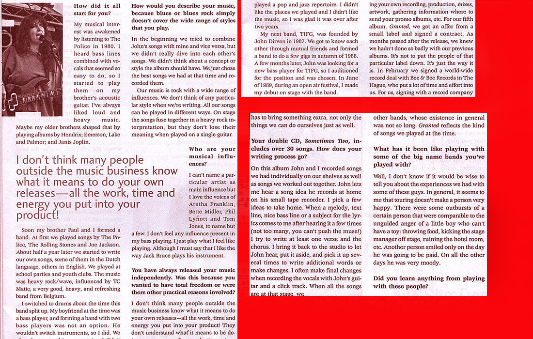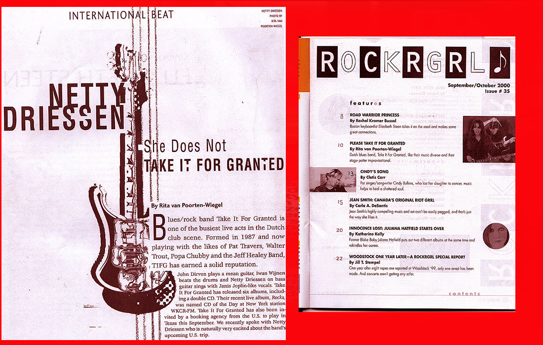 .....................many many times, Oor, Stage, Aardschok, Rif Raf, Big Twin, Mind View, Revu, Eindhovens Dagblad, Friesch Dablad, Groot Eindhoven, Haarlemmermeers Dagblad, Helmonds Dagblad, Traverse, Block, Jassepoes, Hendrixfanclub Germany, Udens Weekblad, Oostbrabant, Gitaar Plus, Gitarist, Volkskrant, Panorama, Alles op Tien,Travers, Aloha,de Sleutel Oss), Tubantia (Twente), de Brug, Leeuwarder Courant, Groovemaster, Dagblad Zaanstreek, Back to the Roots, Metal Maidens, Rockgirl, Kindamuzik, BV Popkrant, Bobtjeblues, Blues Das deutsche Bluesmagazin, Music in Belgium, Brabants Dagblad, Dienblad, Alternative ways, Track, De Stem, Backline, Brabant Pop, Musicmaker, Moors Magazine, GEZIEN-GEHOORD.NL, Blueszine, Maxazine, de Gelderlander, Popmagazine Heaven, Festivalinfo, File Under, and lots of local papers, alone or in combination with Take it for granted, Netty Driessen, Rosa King, Rob Hoeke, Sander Boes, Ben van de Wal, Bertus Borgers, Walter Trout, Ana Popovic, Jesse Gang, Ritchie Severijns, Eamonn Mccormack, Rob Snijders, Fred Hoogendoorn, Sjoerd van Bommel, Hans Dulfer, Peter van Schadewijk, Iwan Wijnen, Tony Peters, Bonki Bongaerts, Thijs van Leer, John Lagrand, Nicko Christiansen and many many more and lots of radio, local, national and all over the globe from Japan, Spain, UK, Denmark, Germany to the USA and back...............