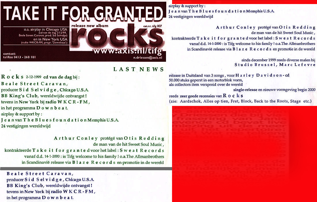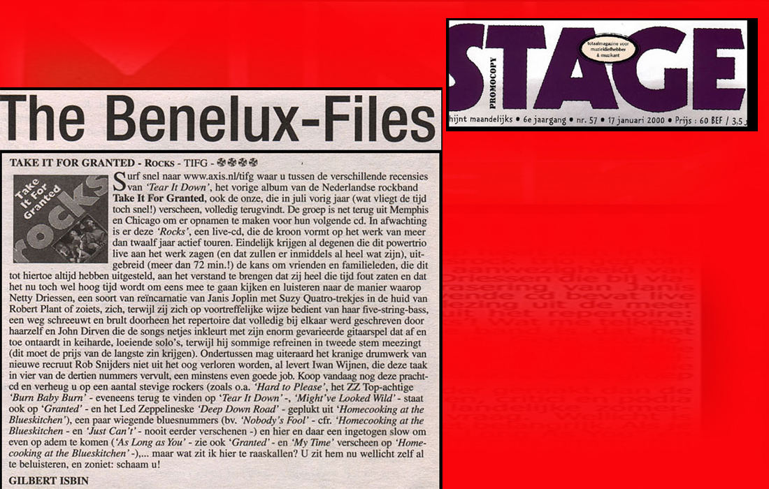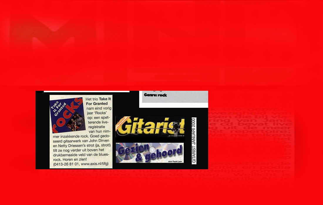 .....................many many times, Oor, Stage, Aardschok, Rif Raf, Big Twin, Mind View, Revu, Eindhovens Dagblad, Friesch Dablad, Groot Eindhoven, Haarlemmermeers Dagblad, Helmonds Dagblad, Traverse, Block, Jassepoes, Hendrixfanclub Germany, Udens Weekblad, Oostbrabant, Gitaar Plus, Gitarist, Volkskrant, Panorama, Alles op Tien,Travers, Aloha,de Sleutel Oss), Tubantia (Twente), de Brug, Leeuwarder Courant, Groovemaster, Dagblad Zaanstreek, Back to the Roots, Metal Maidens, Rockgirl, Kindamuzik, BV Popkrant, Bobtjeblues, Blues Das deutsche Bluesmagazin, Music in Belgium, Brabants Dagblad, Dienblad, Alternative ways, Track, De Stem, Backline, Brabant Pop, Musicmaker, Moors Magazine, GEZIEN-GEHOORD.NL, Blueszine, Maxazine, de Gelderlander, Popmagazine Heaven, Festivalinfo, File Under, and lots of local papers, alone or in combination with Take it for granted, Netty Driessen, Rosa King, Rob Hoeke, Sander Boes, Ben van de Wal, Bertus Borgers, Walter Trout, Ana Popovic, Jesse Gang, Ritchie Severijns, Eamonn Mccormack, Rob Snijders, Fred Hoogendoorn, Sjoerd van Bommel, Hans Dulfer, Peter van Schadewijk, Iwan Wijnen, Tony Peters, Bonki Bongaerts, Thijs van Leer, John Lagrand, Nicko Christiansen and many many more and lots of radio, local, national and all over the globe from Japan, Spain, UK, Denmark, Germany to the USA and back...............