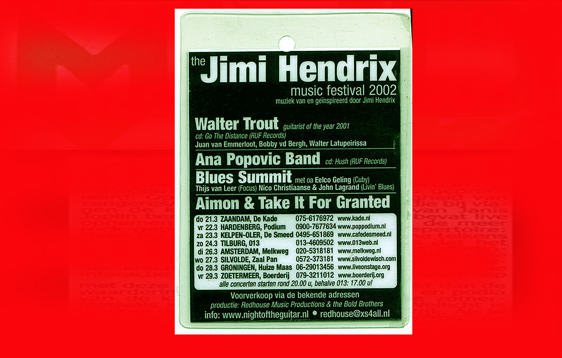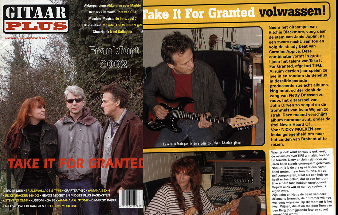 .....................many many times, Oor, Stage, Aardschok, Rif Raf, Big Twin, Mind View, Revu, Eindhovens Dagblad, Friesch Dablad, Groot Eindhoven, Haarlemmermeers Dagblad, Helmonds Dagblad, Traverse, Block, Jassepoes, Hendrixfanclub Germany, Udens Weekblad, Oostbrabant, Gitaar Plus, Gitarist, Volkskrant, Panorama, Alles op Tien,Travers, Aloha,de Sleutel Oss), Tubantia (Twente), de Brug, Leeuwarder Courant, Groovemaster, Dagblad Zaanstreek, Back to the Roots, Metal Maidens, Rockgirl, Kindamuzik, BV Popkrant, Bobtjeblues, Blues Das deutsche Bluesmagazin, Music in Belgium, Brabants Dagblad, Dienblad, Alternative ways, Track, De Stem, Backline, Brabant Pop, Musicmaker, Moors Magazine, GEZIEN-GEHOORD.NL, Blueszine, Maxazine, de Gelderlander, Popmagazine Heaven, Festivalinfo, File Under, and lots of local papers, alone or in combination with Take it for granted, Netty Driessen, Rosa King, Rob Hoeke, Sander Boes, Ben van de Wal, Bertus Borgers, Walter Trout, Ana Popovic, Jesse Gang, Ritchie Severijns, Eamonn Mccormack, Rob Snijders, Fred Hoogendoorn, Sjoerd van Bommel, Hans Dulfer, Peter van Schadewijk, Iwan Wijnen, Tony Peters, Bonki Bongaerts, Thijs van Leer, John Lagrand, Nicko Christiansen and many many more and lots of radio, local, national and all over the globe from Japan, Spain, UK, Denmark, Germany to the USA and back...............