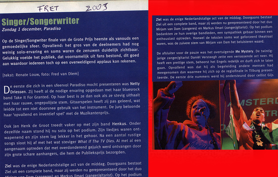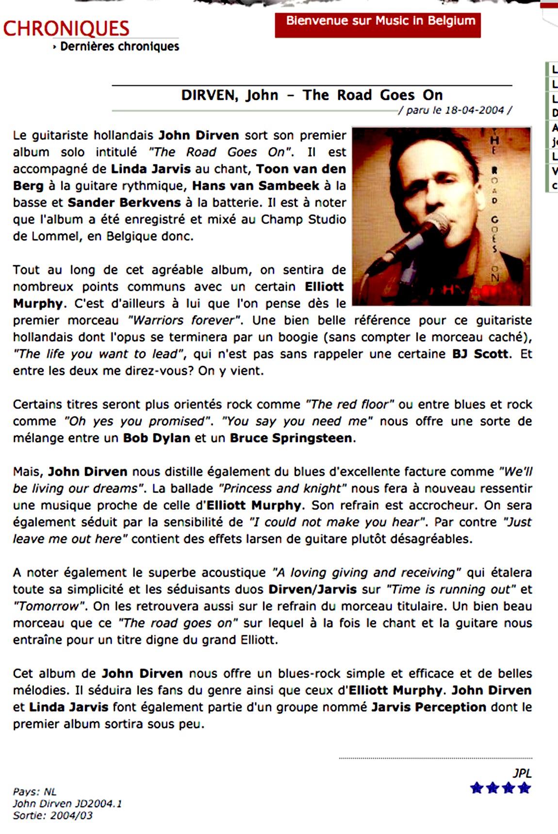 many many times, Oor, Stage, Aardschok, Rif Raf, Big Twin, Mind View, Revu, Eindhovens Dagblad, Friesch Dablad, Groot Eindhoven *Haarlemmermeers Dagblad, Helmonds Dagblad, Traverse, Block, Jassepoes, Hendrixfanclub Germany *Udens Weekblad Oostbrabant, Gitaar Plus, Gitarist, Volkskrant, Panorama, Alles op Tien, Travers, Aloha *de Sleutel Oss), Tubantia (Twente), de Brug, Leeuwarder Courant, Gelderlander *Groovemaster, Dagblad Zaanstreek, Back to the Roots, Metal Maidens, Rockgirl, Kindamuzik, BV Popkrant, Bobtjeblues, Blues Das deutsche Bluesmagazin, Music in Belgium, Brabants Dagblad, Dienblad, Alternative ways, Track, De Stem, Backline, Brabant Pop, Musicmaker * alone or in combination with Take it for granted, Netty Driessen, Rosa King, Rob Hoeke, Sander Boes, Ben van de Wal, Bertus Borgers, Walter Trout, Ana Popovic * Jesse Gang, Ritchie Severijns, Eamonn Mccormack, Rob Snijders, Fred Hoogendoorn, Sjoerd van Bommel, Hans Dulfer, Peter van Schadewijk, Iwan Wijnen, Tony Peters, Bonki Bongaerts, Thijs van Leer, John Lagrand, Nicko Christiansen and many many more lots of radio, local, national and all over the globe from Japan, Spain, UK, Denmark, Germany to the USA and back
