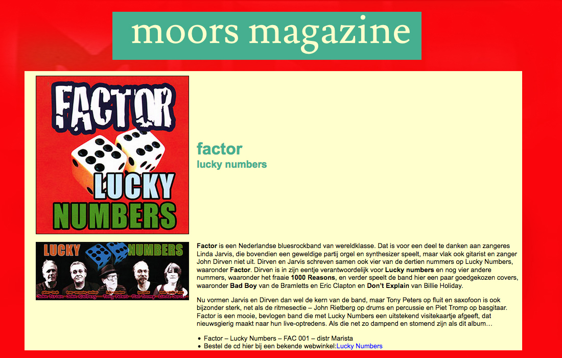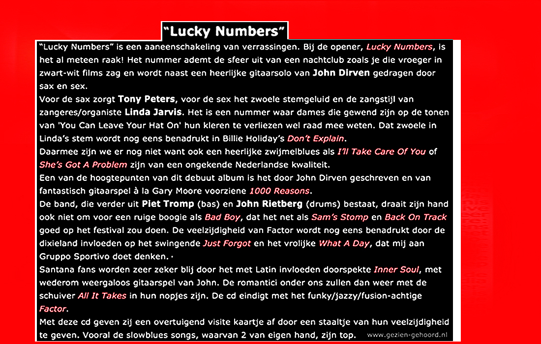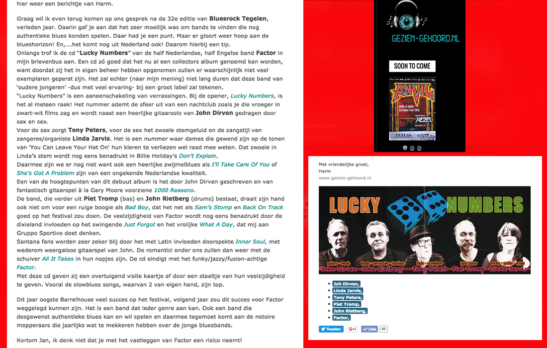 .....................many many times, Oor, Stage, Aardschok, Rif Raf, Big Twin, Mind View, Revu, Eindhovens Dagblad, Friesch Dablad, Groot Eindhoven, Haarlemmermeers Dagblad, Helmonds Dagblad, Traverse, Block, Jassepoes, Hendrixfanclub Germany, Udens Weekblad, Oostbrabant, Gitaar Plus, Gitarist, Volkskrant, Panorama, Alles op Tien,Travers, Aloha,de Sleutel Oss), Tubantia (Twente), de Brug, Leeuwarder Courant, Groovemaster, Dagblad Zaanstreek, Back to the Roots, Metal Maidens, Rockgirl, Kindamuzik, BV Popkrant, Bobtjeblues, Blues Das deutsche Bluesmagazin, Music in Belgium, Brabants Dagblad, Dienblad, Alternative ways, Track, De Stem, Backline, Brabant Pop, Musicmaker, Moors Magazine, GEZIEN-GEHOORD.NL, Blueszine, Maxazine, de Gelderlander, Popmagazine Heaven, Festivalinfo, File Under, and lots of local papers, alone or in combination with Take it for granted, Netty Driessen, Rosa King, Rob Hoeke, Sander Boes, Ben van de Wal, Bertus Borgers, Walter Trout, Ana Popovic, Jesse Gang, Ritchie Severijns, Eamonn Mccormack, Rob Snijders, Fred Hoogendoorn, Sjoerd van Bommel, Hans Dulfer, Peter van Schadewijk, Iwan Wijnen, Tony Peters, Bonki Bongaerts, Thijs van Leer, John Lagrand, Nicko Christiansen and many many more and lots of radio, local, national and all over the globe from Japan, Spain, UK, Denmark, Germany to the USA and back...............