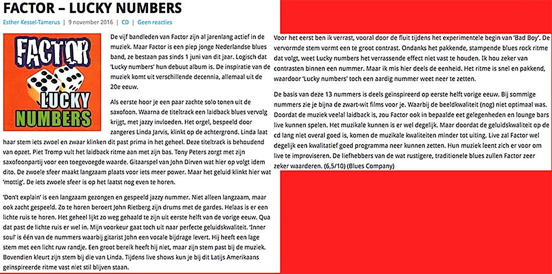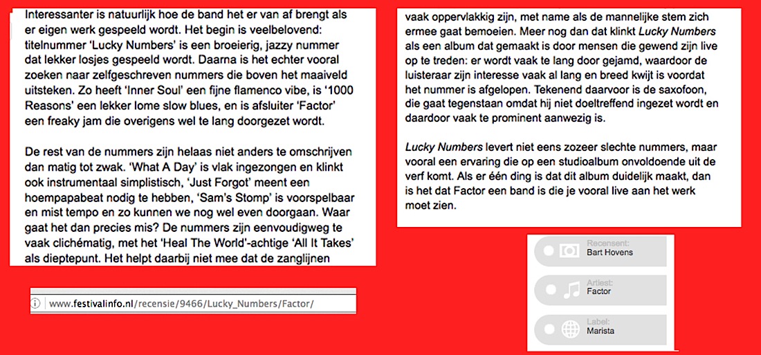 Uit die recensie spreekt boekdelen de aversie tegen de band Factor en de CD Lucky Numbers.